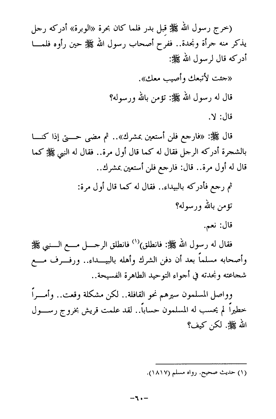 قال - صلى الله عليه وسلم -: "فارجع فلن أستعين. بمشرك" .. ثم مضى حتى إذا كنا بالشجرة أدركه الرجل فقال له كما قال أول مرة .. فقال له النبي - صلى الله عليه وسلم - كما قال له أول مرة .. قال: فارجع فلن أستعين. بمشرك ..