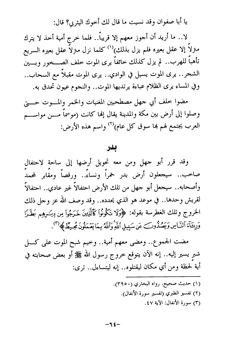 لا .. ما أريد أن أجوز معهم إلا قريبًا .. فلما خرج أمية أخذ لا يترك متزلًا إلا عقل بعيره فلم يزل بذلك) (¬1) كلما نزل منزلًا عقل بعيره السريع تأهبًا للهرب .. لم يزل كذلك خائفًا يرى الموت خلف الصخور وبين الشجر .. يرى الموت يسيل في الوادي .. يرى الموت مقبلًا مع السحاب .. وفي المساء يرى الظلام عباءة يرتديها الموت .. والنجوم عيون تحدق به.