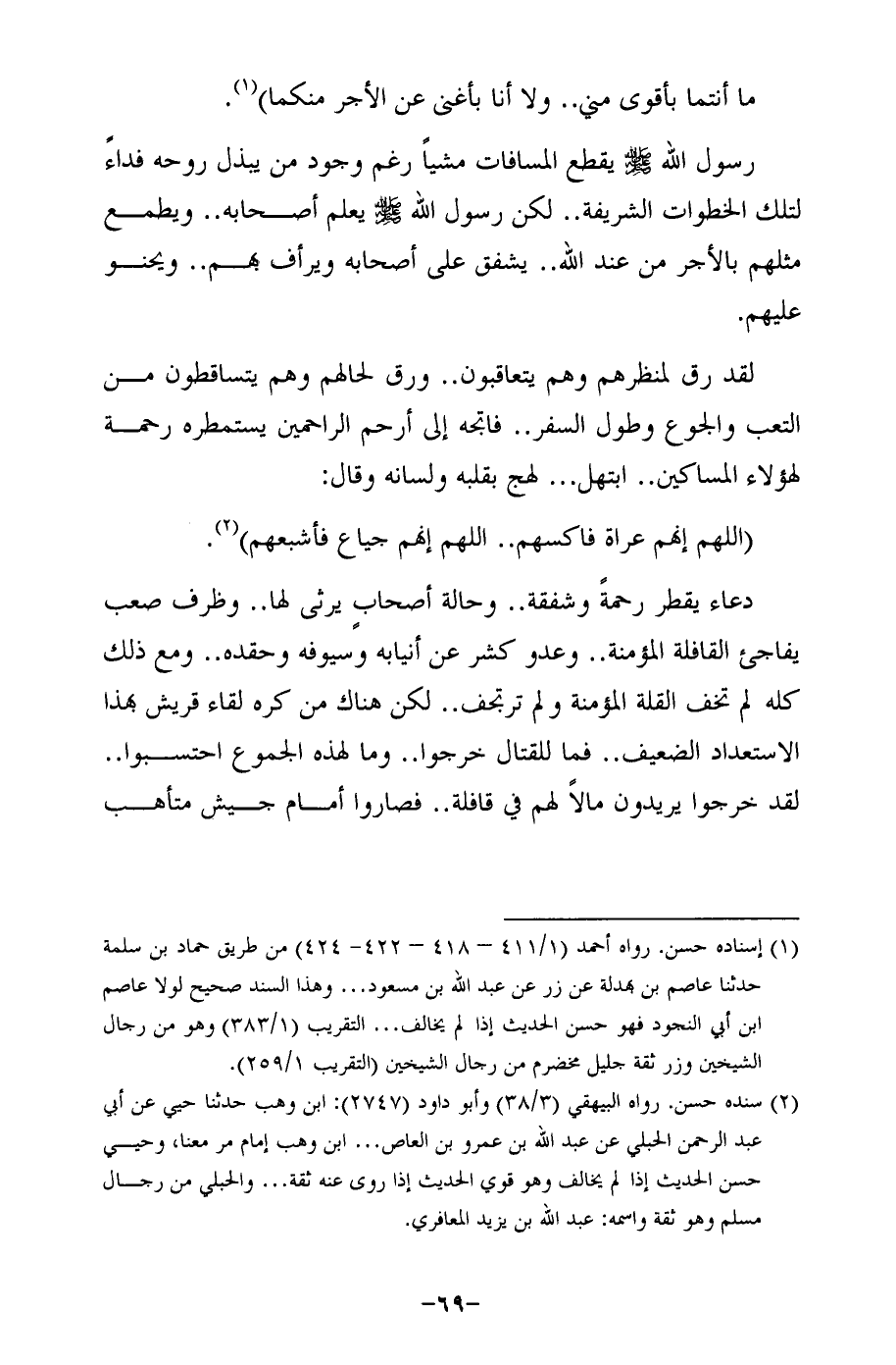 رسول الله - صلى الله عليه وسلم - يقطع المسافات مشيًا رغم وجود من يبذل روحه فداءً لتلك الخطوات الشريفة .. لكن رسول الله - صلى الله عليه وسلم - يعلم أصحابه .. ويطمع مثلهم بالأجر من عند الله .. يشفق على أصحابه ويرأف بهم .. ويحنو عليهم.