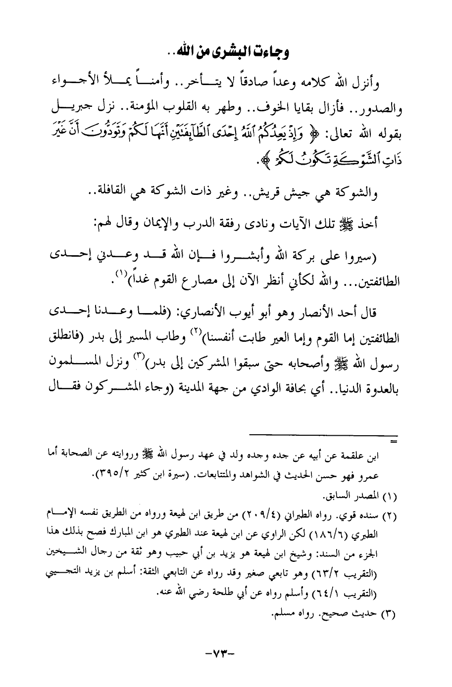 وأنزل الله كلامه وعدًا صادقًا لا يتأخر .. وأمنًا يملأ الأجواء والصدور .. فأزال بقايا الخوف .. وطهر به القلوب المؤمنة .. نزل جبريل بقول الله تعالى: {وَإِذْ يَعِدُكُمُ اللَّهُ إِحْدَى الطَّائِفَتَيْنِ أَنَّهَا لَكُمْ وَتَوَدُّونَ أَنَّ غَيْرَ ذَاتِ الشَّوْكَةِ تَكُونُ لَكُمْ}.