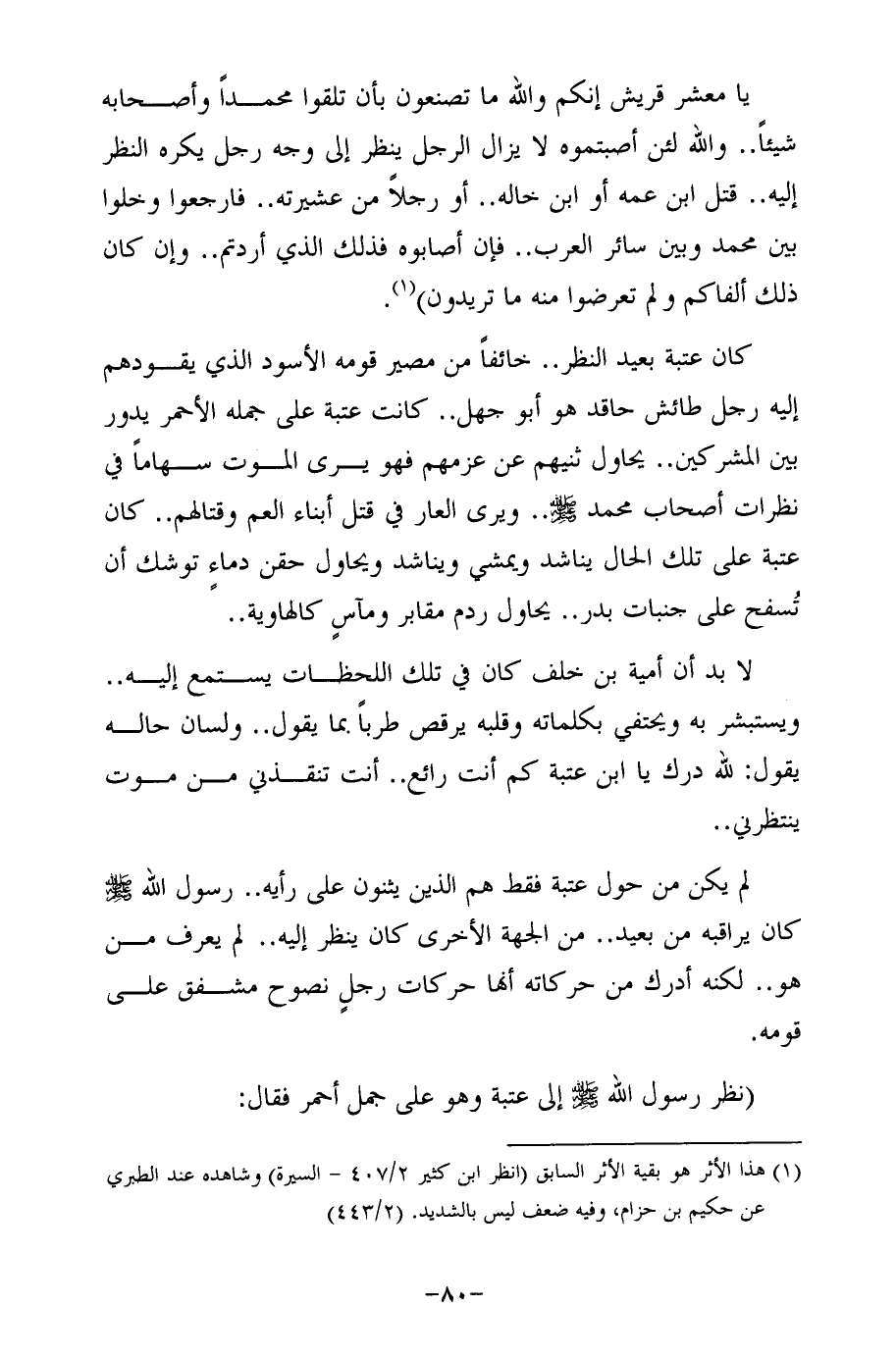 كان عتبة بعيد النظر .. خائفا من مصير قومه الأسود الذي يقودهم إليه رجل طائش حاقد هو أبو جهل .. كانت عتبة على جمله الأحمر يدور بين المشركين .. يحاول ثنيهم عن عزمهم فهو يرى الموت سهامًا في نظرات أصحاب محمَّد - صلى الله عليه وسلم - .. ويرى العار في قتل أبناء العم وقتالهم .. كان عتبة على تلك الحال يناشد ويمشي ويناشد ويحاول حقن دماءٍ توشك أن تُسفح على جنبات بدر .. يحاول ردم مقابر ومآسٍ كالهاوية ..