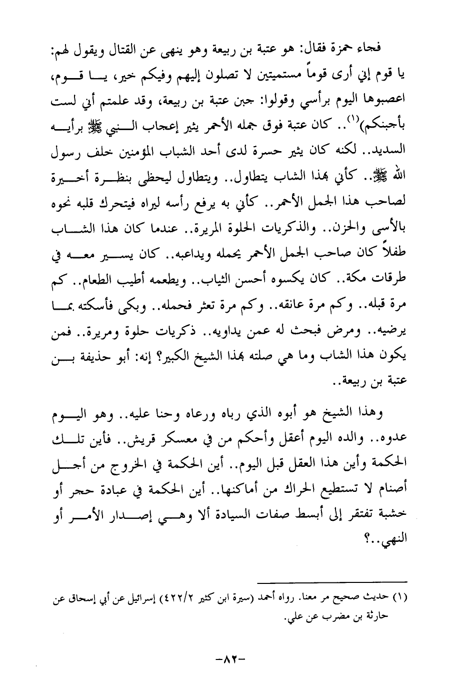 فجاء حمزة فقال: هو عتبة بن ربيعة وهو ينهى عن القتال ويقول لهم: يا قوم إني أرى قومًا مستميتين لا تصلون إليهم وفيكم خير، يا قوم، اعصبوها اليوم برأسي وقولوا: جبن عتبة بن ربيعة، وقد علمتم أني لست بأجبنكم) (¬1) .. كان عتبة فوق جمله الأحمر يثير إعجاب النبي - صلى الله عليه وسلم - برأيه السديد .. لكنه كان يثير حسرة لدى أحد الشباب المؤمنين خلف رسول الله - صلى الله عليه وسلم - .. كأني بهذا الشاب يتطاول .. ويتطاول ليحظى بنظرة أخيرة لصاحب هذا الجمل الأحمر .. كأني به يرفع رأسه ليراه فيتحرك قلبه نحوه بالأسى والحزن .. والذكريات الحلوة المريرة .. عندما كان هذا الشاب طفلًا كان صاحب الجمل الأحمر يحمله ويداعبه .. كان يسير معه في طرقات مكة .. كان يكسوه أحسن الثياب .. ويطعمه أطيب الطعام .. كم مرة قبله .. وكم مرة عانقه .. وكم مرة تعثر فحمله .. وبكى فأسكته بما يرضيه .. ومرض فبحث له عمن يداويه .. ذكريات حلوة ومريرة .. فمن يكون هذا الشاب وما هي صلته بهذا الشيخ الكبير؟ إنه: أبو حذيفة بن عتبة بن ربيعة ..