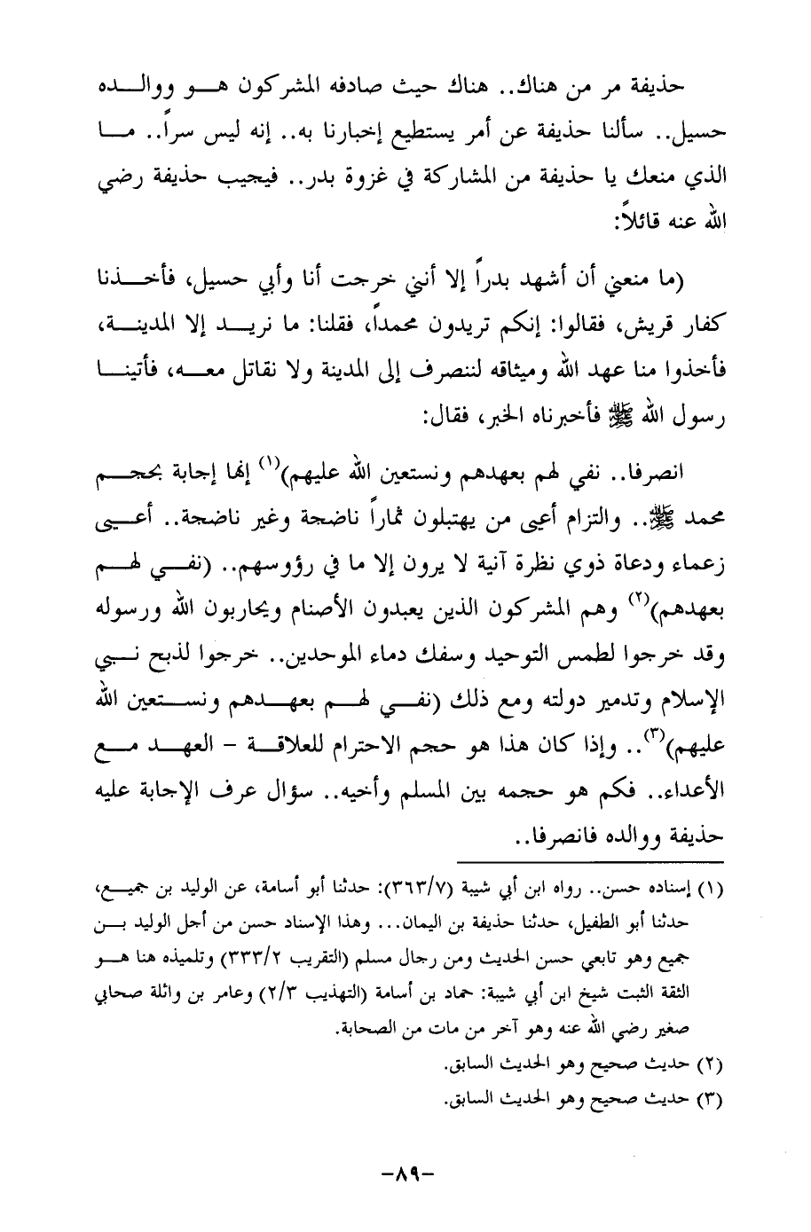 (ما منعني أن أشهد بدرًا إلا أنني خرجت أنا وأبي حسيل، فأخذنا كفار قريش، فقالوا: إنكم تريدون محمدًا، فقلنا: ما نريد إلا المدينة، فأخذوا منا عهد الله وميثاقه لننصرف إلى المدينة ولا نقاتل معه، فأتينا رسول الله - صلى الله عليه وسلم - فأخبرناه الخبر، فقال: