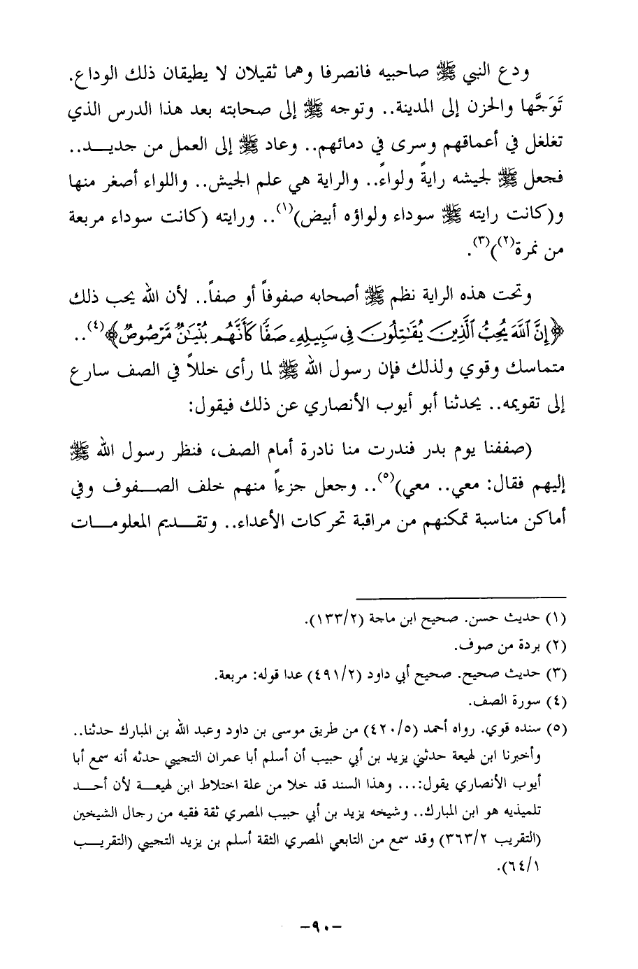 وتحت هذه الراية نظم - صلى الله عليه وسلم - أصحابه صفوفًا أو صفًا .. لأن الله يحب ذلك {إِنَّ اللَّهَ يُحِبُّ الَّذِينَ يُقَاتِلُونَ فِي سَبِيلِهِ صَفًّا كَأَنَّهُمْ بُنْيَانٌ مَرْصُوصٌ} (¬4) .. متماسك وقوي ولذلك فإن رسول الله - صلى الله عليه وسلم - لما رأى خللًا في الصف سارع إلى تقويمه .. يحدثنا أبو أيوب الأنصاري عن ذلك فيقول: