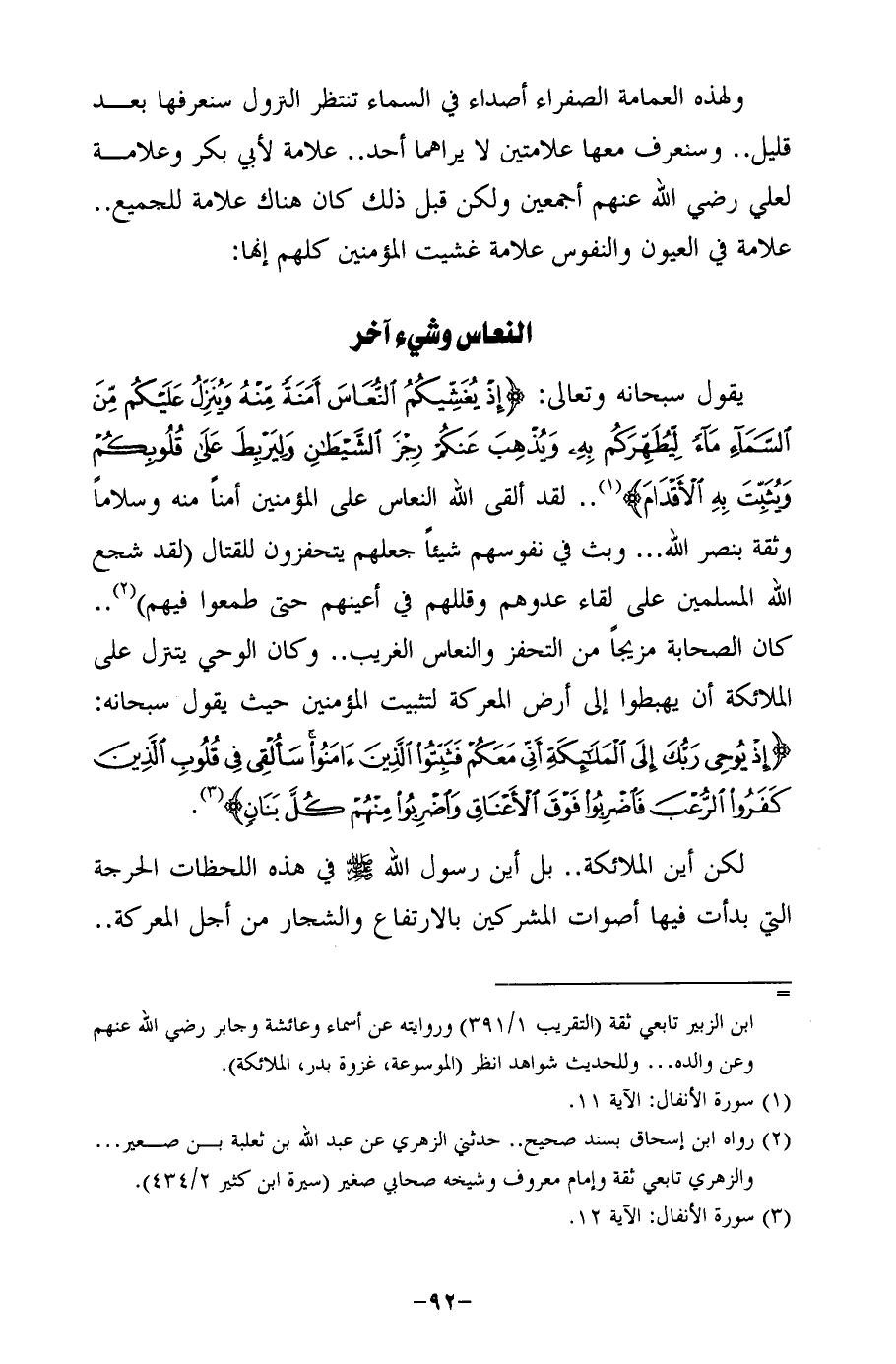 يقول سبحانه وتعالى: {إِذْ يُغَشِّيكُمُ النُّعَاسَ أَمَنَةً مِنْهُ وَيُنَزِّلُ عَلَيْكُمْ مِنَ السَّمَاءِ مَاءً لِيُطَهِّرَكُمْ بِهِ وَيُذْهِبَ عَنْكُمْ رِجْزَ الشَّيْطَانِ وَلِيَرْبِطَ عَلَى قُلُوبِكُمْ وَيُثَبِّتَ بِهِ الْأَقْدَامَ} (¬1) .. لقد ألقى الله النعاس على المؤمنين أمنًا منه وسلامًا وثقة بنصر الله ... وبث في نفوسهم شيئًا جعلهم يتحفزون للقتال (لقد شجع الله المسلمين على لقاء عدوهم وقللهم في أعينهم حتى طمعوا فيهم) (¬2) .. كان الصحابة مزيجًا من التحفز والنعاس الغريب .. وكان الوحي يتنزل على الملائكة أن يهبطوا إلى أرض المعركة لتثبيت المؤمنين حيث يقول سبحانه: {إِذْ يُوحِي رَبُّكَ إِلَى الْمَلَائِكَةِ أَنِّي مَعَكُمْ فَثَبِّتُوا الَّذِينَ آمَنُوا سَأُلْقِي فِي قُلُوبِ الَّذِينَ كَفَرُوا الرُّعْبَ فَاضْرِبُوا فَوْقَ الْأَعْنَاقِ وَاضْرِبُوا مِنْهُمْ كُلَّ بَنَانٍ} (¬3).