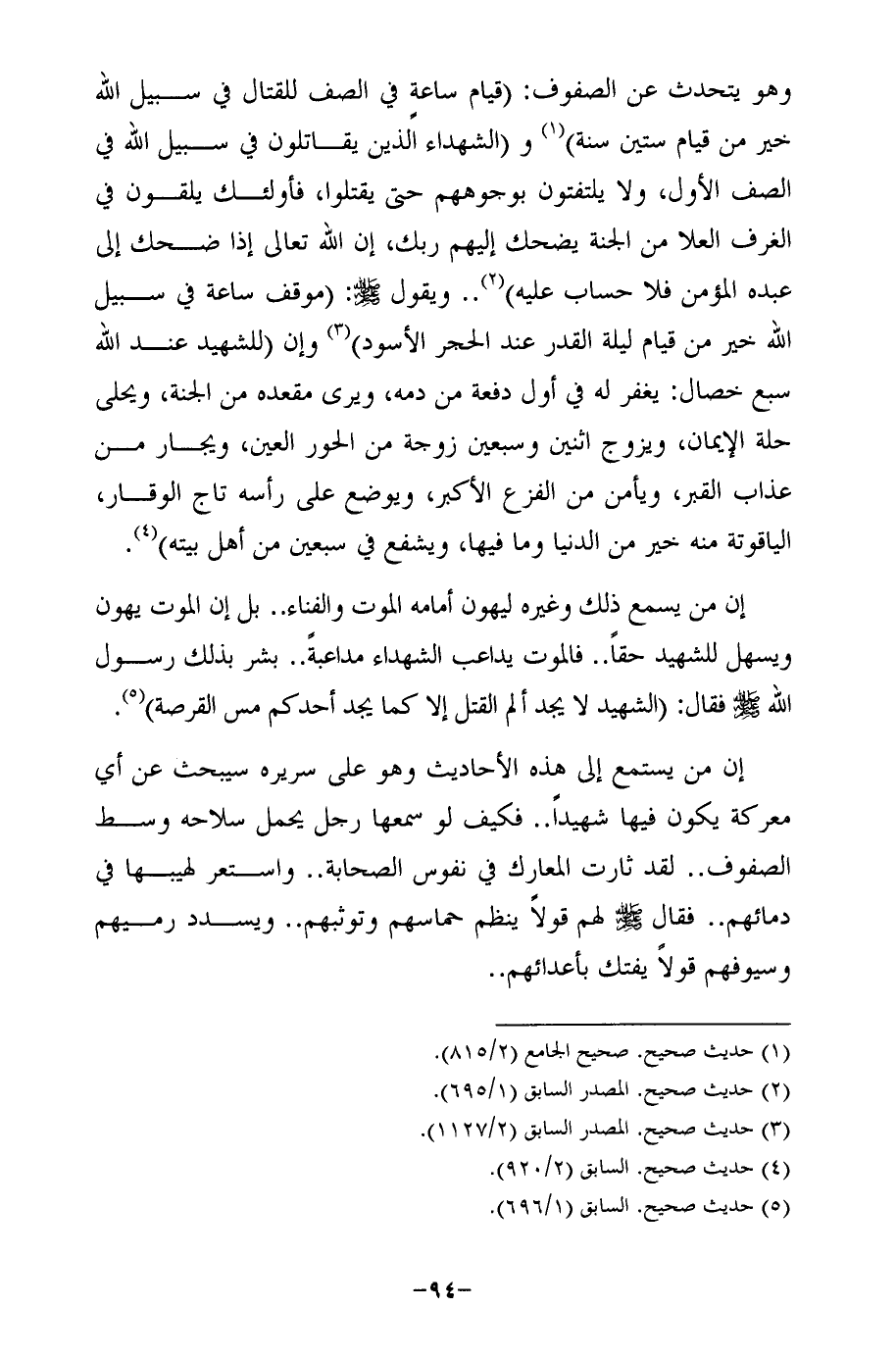 وهو يتحدث عن الصفوف: (قيام ساعة في الصف للقتال في سبيل الله خير من قيام ستين سنة) (¬1) و (الشهداء الذين يقاتلون في سبيل الله في الصف الأول، ولا يلتفتون بوجوههم حتى يقتلوا، فأولئك يلقون في الغرف العلا من الجنة يضحك إليهم ربك، إن الله تعالى إذا ضحك إلى عبده المؤمن فلا حساب عليه) (¬2) .. ويقول - صلى الله عليه وسلم -: (موقف ساعة في سبيل الله خير من قيام ليلة القدر عند الحجر الأسود) (¬3) وإن (للشهيد عند الله سبع خصال: يغفر له في أول دفعة من دمه، ويرى مقعده من الجنة، ويحلى حلة الإيمان, ويزوج اثنين وسبعين زوجة من الحور العين، ويجار من عذاب القبر، ويأمن من الفزع الأكبر، ويوضع على رأسه تاج الوقار، الياقوتة منه خير من الدنيا وما فيها، ويشفع في سبعين من أهل بيته) (¬4).