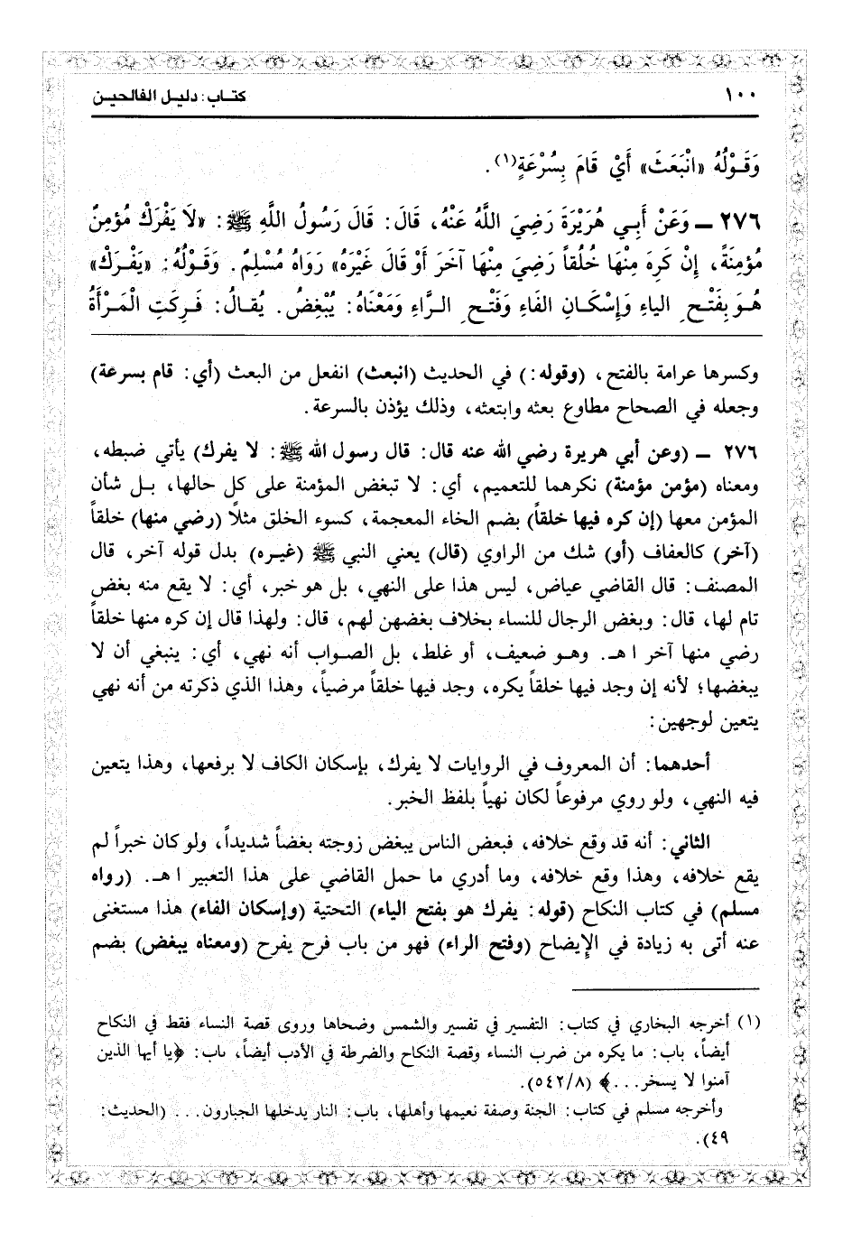 الثاني: أنه قد وقع خلافه فبغض الناس يبغض زوجته بغضاً شديداً ولو كان خبراً لم يقع خلافه وهذا وقع خلافه، وما أدري ما حمل القاضي على هذا التعبير اهـ. (رواه مسلم) في كتاب النكاح (قوله: يفرك هو بفتح الياء) التحتية (وإسكان الفاء) هذا مستغنى عنه أتى به زيادة في الإيضاح (وفتح الراء) فهو من باب فرح يفرح (ومعناه يبغض) بضم