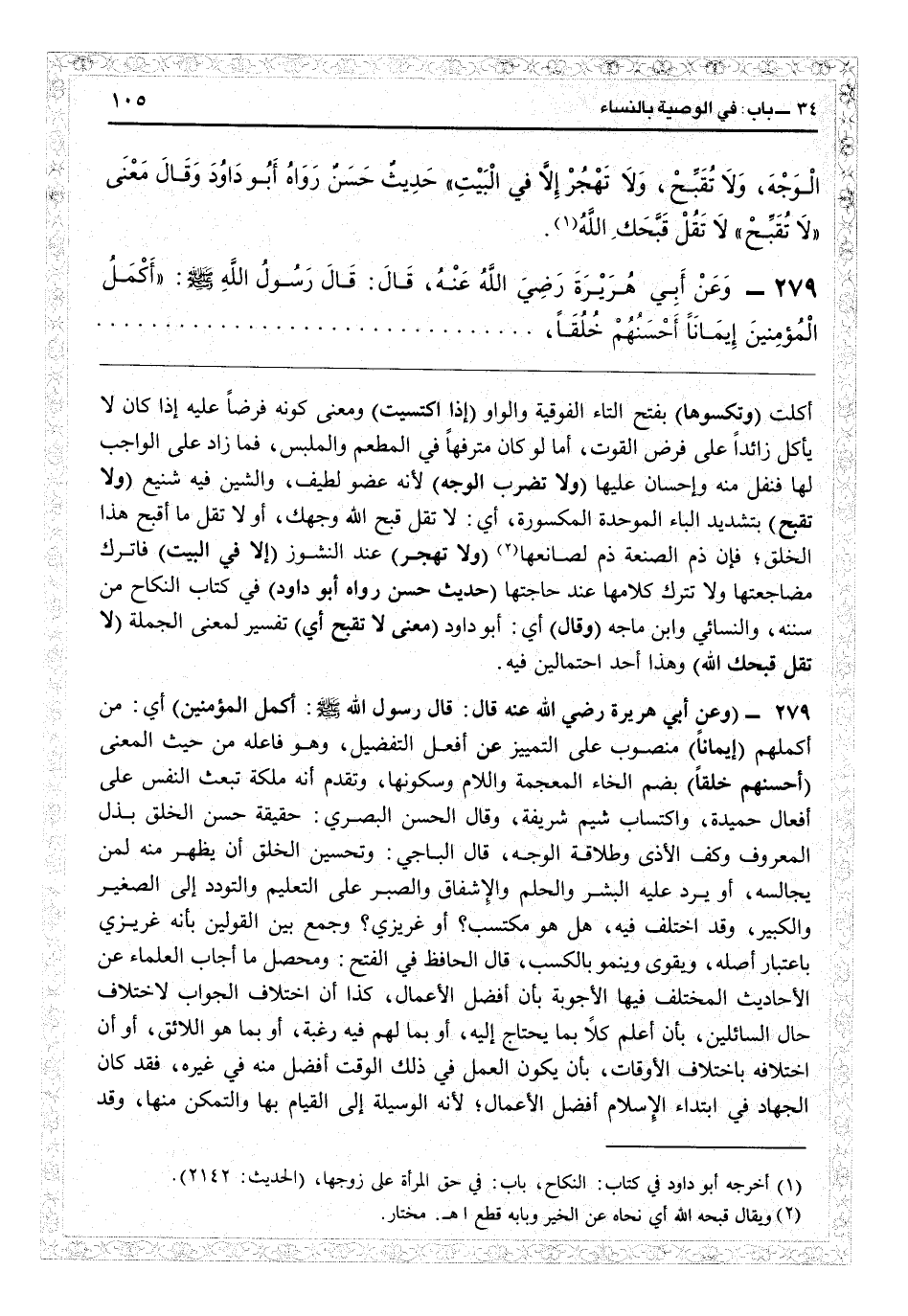 أكلت (وتكسوها) بفتح التاء الفوقية والواو (إذا اكتسيت) ومعنى كونه فرضاً عليه إذا كان لا يأكل زائداً على فرض القوت، أما لو كان مترفها في المطعم والملبس فما زاد على الواجب لها فنفل منه وإحسان عليها (ولا تضرب الوجه) لأنه عضو لطيف والشين فيه شنيع (ولا تقبح) بتشديد الباء الموحدة المكسورة: أي لا تقل قبح الله وجهك أو لا تقل ما أقبح هذا الخلق، فإن ذمّ الصنعة ذم لصانعها (ولا تهجر) عند النشوز (إلا في البيت) فاترك مضاجعتها ولا تترك كلامها عند حاجتها (حديث حسن رواه أبو داود) في كتاب النكاح من سننه والنسائي وابن ماجه (وقال) أي أبو داود (معنى لا تقبح أي) تفسير لمعنى الجملة (لا تقل قبحك ا) وهذا أحد احتمالين فيه.