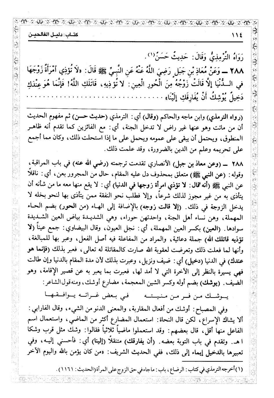 2877 - (وعن معاذ بن جبل) الأنصاري تقدمت ترجمته (رضي الله عنه) في باب المراقبة، وقوله: (عن النبي) متعلق بمحذوف دلّ عليه المقام حال من المجرور بعن: أي ناقلاً عن النبي (أنه قال: لا تؤذي امرأة زوجها في الدنيا) أي لا يقع منها معه ما من شأنه أن يتأذى به من غير مجوّز لذلك شرعاً، وإلا فطلب نحو النفقة ممن يتأذى بها لنحو بخله لا يدخل الزوجة في ذلك (إلا قالت زوجه) بالإضافة إلى الهاء (من الحور) بضم الحاء المهملة وهن نساء أهل الجنة، واحدتهن حوراء: وهي الشديدة بياض العين الشديدة سوادها (العين) بكسر العين المهملة: أي بخل العيون. وقال البيضاوي جمع عيناء (لا تؤذيه قاتلك ا) جملة دعائية والمراد من المفاعلة فيه أصل الفعل وعبر بها للمبالغة، وأنها لما فعلت ذلك وتعرضت لعقوبة الله صارت كالمقاتلة له تعالى فعبر بذلك (فإنما هو عندك) في الدنيا (دخيل) أي ضيف ونزيل، وعبرت بذلك لأن مدة المقام بالدنيا وإن طالت فهي يسيرة بالنظر إلى الآخرة التي لا أمد لها، فعبرت بما يعبر به عن قصير الإقامة وهو الضيف (يوشك) بضم أوله وكسر الشين المعجمة مضارع أوشك ومنه قوله الشاعر: