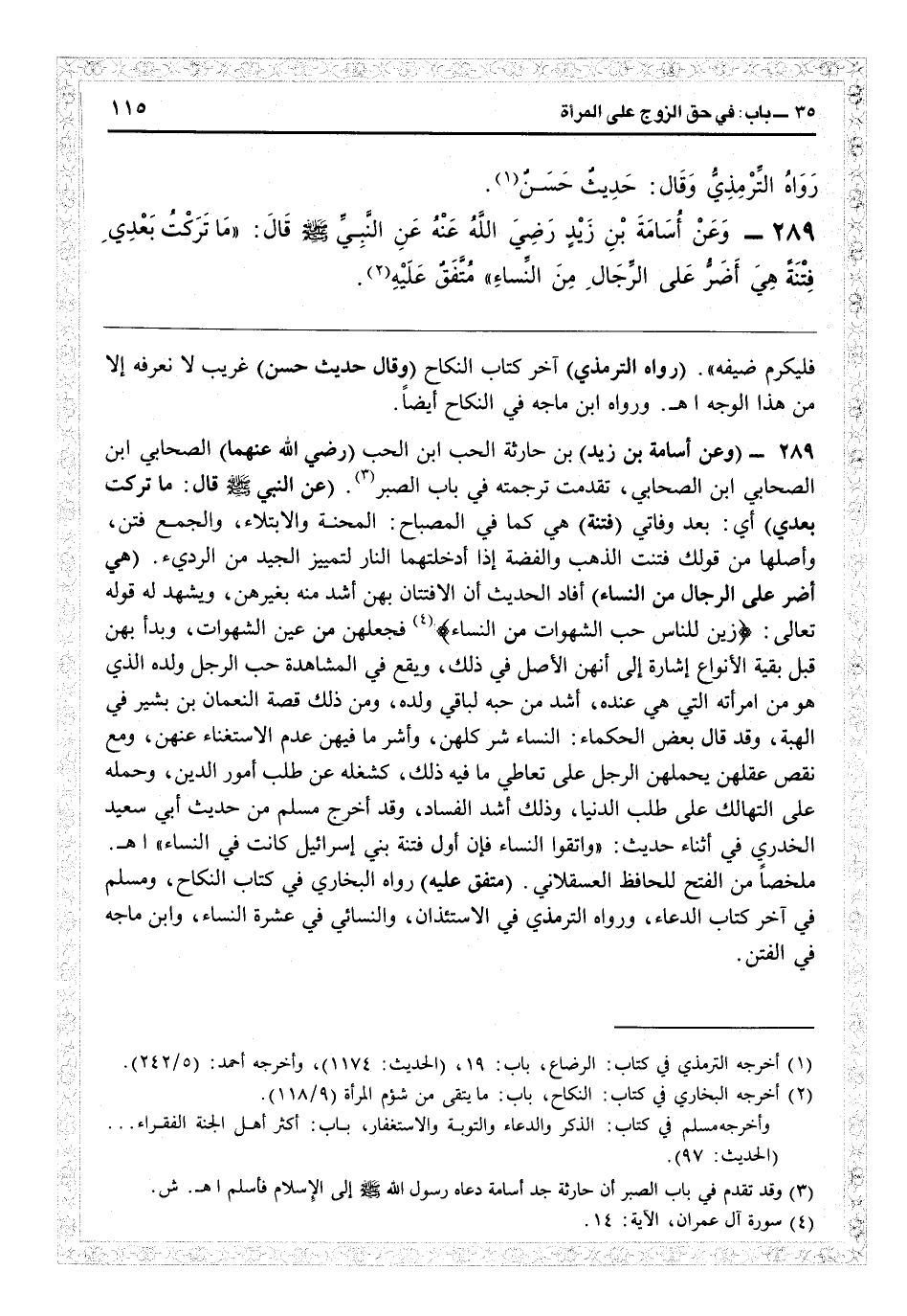 2888 - (وعن أسامة بن زيد) بن حارثة الحب ابن الحب (رضي الله عنهما) الصحابي ابن الصحابي تقدمت ترجمته في باب الصبر (عن النبي قال: ما تركت بعدي) أي بعد وفاتي (فتنة) هي كما في «المصباح» : المحنة والابتلاء، والجمع فتن، وأصلها من قولك فتنت الذهب والفضة إذا أدخلتهما النار لتمييز الجيد من الردىء (هي أضرّ على الرجال من النساء) أفاد الحديث أن الافتتان بهن أشد منه بغيرهن، ويشهد له قوله تعالى: {زين الناس حب الشهوات من النساء} (آل عمران: 14) فجعلهن من عين الشهوات وبدأ بهن قبل بقية الأنواع إشارة إلى أنهن الأصل في ذلك. ويقع في المشاهدة حبّ الرجل ولده الذي هو من امرأته التي هي عنده أشد من حبه لباقي ولده، ومن ذلك قصة النعمان بن بشير في الهبة. وقد قال بعض الحكماء: النساء شرّ كلهن وأشرّ ما فيهن عدم الاستغناء عنهن، ومع نقص عقلهن يحملن الرجل على تعاطي ما فيه ذلك، كشغله عن طلب أمور الدين وحمله على التهالك على طلب الدنيا، وذلك أشد الفساد. وقد أخرج مسلم من حديث أبي سعيدالخدري في أثناء حديث «واتقوا النساء فإن أول فتنة بني إسرائيل كانت في النساء» . اهـ. ملخصاً من «الفتح» للحافظ العسقلاني (متفق عليه) رواه البخاري في كتاب النكاح، ومسلم في آخر كتاب الدعاء، ورواه الترمذي في الاستئذان، والنسائي في عشرة النساء، وابن ماجه في الفتن.