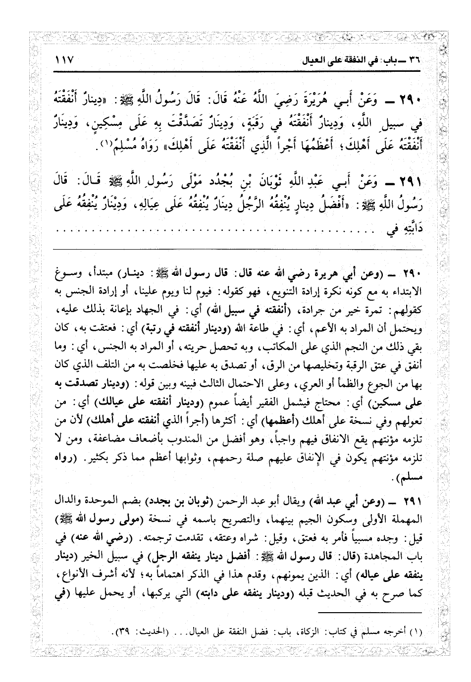 2891 - (وعن أبي هريرة رضي الله عنه قال: قال رسول الله: دينار) مبتدأ وسوغ الابتداء به مع كونه نكرة إرادة التنويع فهو كقوله: فيوم لنا ويوم علينا، أو إرادة الجنس به كقولهم: تمرة خير من جرادة (أنفقته في سبيل ا) أي في الجهاد بإعانة ذلك عليه، ويحتمل أن المراد به الأعم: أي في طاعة الله (ودينار أنفقته في رقبة) أي فعتقت به كأن بقي ذلك من النجم الذي على المكاتب وبه تحصل حريته، أو المراد به الجنس: أي وما أنفق في عتق الرقبة وتخليصها من الرق، أو تصدق به عليها فخلصت به من التلف الذي كان بها من الجوع والظمأ أو العري، وعلى الاحتمال الثالث فبينه وبين قوله: (ودينار تصدقت به على مسكين) أي محتاج فيشمل الفقير أيضاً عمومه (ودينار أنفقته على عيالك) أي من تعولهم، وفي نسخة على أهلك (أعظمها) أي أكثرها (أجراً الذي أنفقته على أهلك) لأن من تلزمه مؤنتهم يكون في الإنفاق عليهم صلة رحمهم، وثوابها أعظم مما ذكر بكثير (رواه مسلم) /
