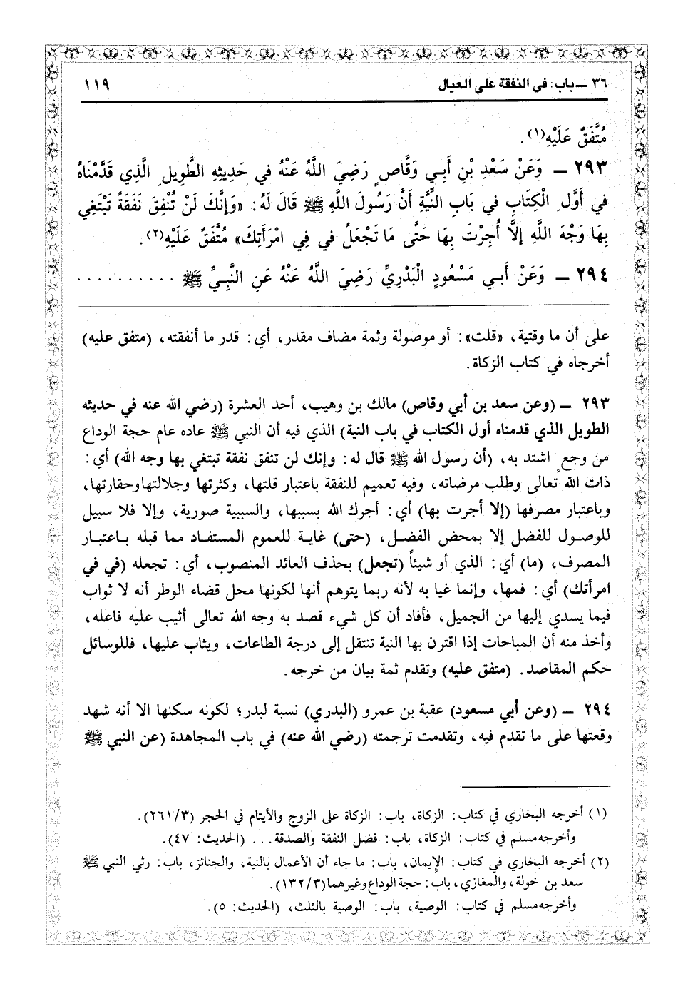 2924 - (وعن سعد بن أبي وقاص) مالك بن وهيب أحد العشرة (رضي الله عنه في حديثه الطويل الذي قدمناه أول الكتاب في باب النية) الذي فيه أن النبي عاده عام حجة الوداع من وجع اشتد به (أن رسول الله - صلى الله عليه وسلم - قال له: وإنك لن تنفق نفقة تبتغي بها وجه ا) أي ذات الله تعالى وطلب مرضاته، وفيه تعميم للنفقة باعتبار قلتها وكثرتها وجلالها وحقارتها وباعتبار مصرفها (إلا أجرت بها) أي أجرك الله بسببها السببية صورية وإلا فلا سبيل للوصول للفضل إلا بمحض الفضل (حتى) غاية للعموم المستفاد مما قبله باعتبار المصرف (ما) أي الذي أو شيئاً (تجعل) بحذف العائد المنصوب: أي تجعله (في في امرأتك) أي فمها، وإنما غيابه لأنه ربما يتوهم أنها لكونها محل قضاء الوطر أنه لا ثواب فيما يسدي إليها من الجميل، فأفاد أن كل شيء قصد به وجه الله تعالى أثيب عليه فاعله. وأخذ منه أن المباحات إذا اقترن بها النية تنتقل إلى درجة الطاعات ويثاب عليها، فللوسائل حكم المقاصد (متفق عليه) وتقدّم ثمة بيان من خرّجه.