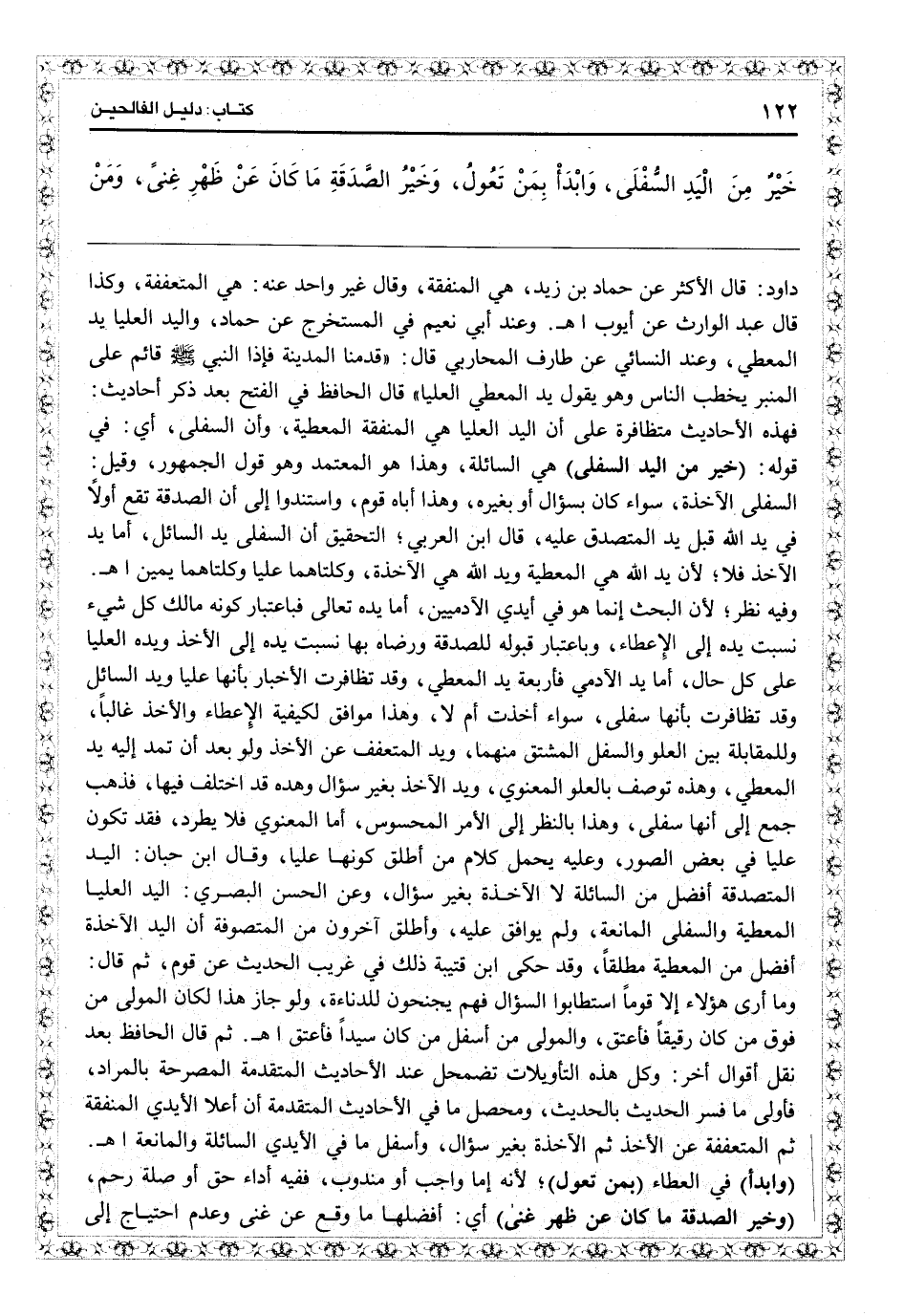 داود: قال الأكثر عن حماد بن زيد: هي المنفقة، وقال غير واحد عنه: هي المتعففة، وكذا قال عبد الوارث عن أيوب اهـ. وعند أبي نعيم في «المستخرج» عن حماد «واليد العليا يد المعطي» . وعند النسائي عن طارف المحاربي قال: «قدمنا المدينة فإذا النبي قائم على المنبر يخطب الناس وهو يقول: يد المعطي العليا» قال الحافظ في «الفتح» بعد ذكر أحاديث: فهذه الأحاديث متظافرة على أن اليد العليا هي المنفقة المعطية وأن السفلى أي في قوله: (خير من اليد السفلى) هي السائلة، وهذا هو المعتمد. وهو قول الجمهور، وقيل السفلى الآخذة سواء كان بسؤال أو بغيره، وهذا أباه قوم واستندوا إلى أن الصدقة تقع أولاً في يد الله قبل يد المتصدق عليه. قال ابن العربي: التحقيق أن السفلى يد السائل أما يد الآخذ فلا، لأن يد اهي المعطية ويد اهي الآخذة وكلتاهما عليا وكلتاهما يمين اهـ. وفيه نظر لأن البحث إنما هو في أيدي الآدميين، أما يده تعالى فباعتبار كونه مالك كل شيء نسبت يده إلى الإعطاء، وباعتبار قبوله للصدقة ورضاه بها نسبت يده إلى الأخذ ويده العليا على كل حال. أما يد الأدمي فأربعة: يد المعطي وقد تظافرت الأخبار بأنها عليا ويد السائل وقد تظافرت بأنها سفلى سواء أخذت أم لا، وهذا موافق لكيفية الإعطاء والأخذ غالباً، وللمقابلة بين العلوّ والسفل المشتق منهما، ويد المتعفف عن الأخذ ولو بعد أن تمد إليه يد المعطي، وهذه وهذه توصف بالعلو المعنوي، ويد الآخذ بغير سؤال، وهذه قد اختلف فيها، فذهب جمع إلى أنها سفلى وهذا بالنظر إلى الأمر المحسوس، أما المعنوي فلا يطرد فقد تكون علياً في بعض الصور وعليه يحمل كلام من أطلق كونها عليا. وقال ابن حبان: اليد المتصدقة أفضل من السائلة لا الآخذة بغير سؤال وعن الحسن البصري: اليد العليا المعطية والسفلى المانعة ولم يوافق عليه. وأطلق آخرون