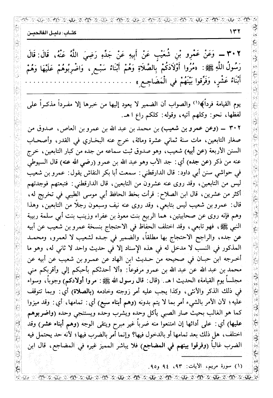 (قال: قال رسول الله: مروا أولادكم) وجوباً وسواء في ذلك الذكر والأنثى، وكذا يجب عليه أمر زوجته وخادمه (بالصلاة) أي وبما تتوقف عليه لأن الأمر بالشيء أمر بما لا يتم بدونه (وهم أبناء سبع) أي تمامها: أي وقد ميزوا، كما والغالب بحيث صار الصبيّ يأكل وحده ويشرب وحده ويستنجي وحده (واضربوهم عليها) أي على أدائها إن امتنعوا منه ضرباً غير مبرّح ويتقّي الوجه (وهم أبناء عشر) وقد اختلف هل ذلك بعد تمامها أو بالدخول فيها، وإنما أمر بالضرب فيها لأنه حدّ يحتمل فيه الضرب غالباً (وفرقوا بينهم في المضاجع) فلا يباشر المميز غيره في المضاجع، قال ابن