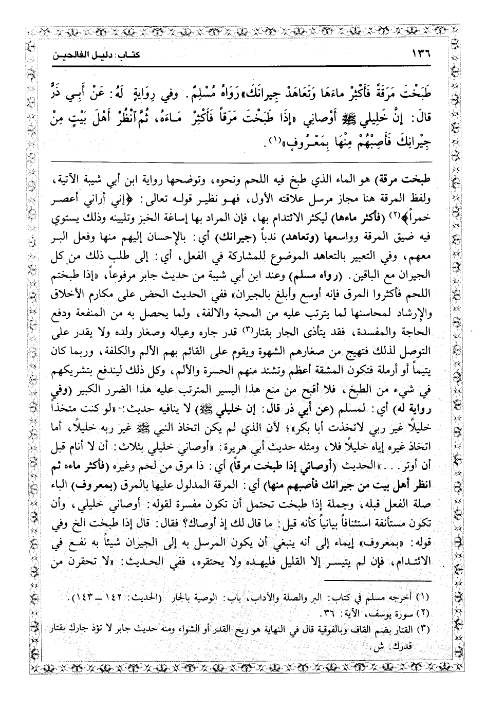 طبخت مرقة) هو الماء الذي طبخ فيه اللحم ونحوه، وتوضحها رواية ابن أبي شيبة الآتية، ولفظ المرقة هنا مجاز مرسل علاقته الأول فهو نظير قوله تعالى: {إني أراني أعصر خمراً} (يوسف: 36) (فأكثر ماءها) ليكثر الائتدام بها، فإن المراد بها إساغة الخبز وتليينه، وذلك يستوي فيه ضيق المرقة وواسعها (وتعاهد) ندباً (جيرانك) أي بالإحسان إليهم وفعل البرّ معهم، وفي التعبير بالتعاهد الموضوع للمشاركة في الفعل: أي: إلى طلب ذلك من كل الجيران مع الباقين (رواه مسلم) وعند ابن أبي شيبة من حديث جابر مرفوعاً «إذا طبختم اللحم فأكثروا المرق/ فإنه أوسع وأبلغ بالجيران» . ففي الحديث الحض على مكارم الأخلاق والإرشاد لمحاسنها لما يترتب عليه من المحبة والألفة ولما يحصل به من المنفعة ودفع الحاجة والمفسدة فقد يتأذى الجار بقتار قدر جاره وعياله وصغار ولده ولا يقدر على التوصل لذلك، فتهيج من صغارهم الشهوة ويقوم على القائم بهم الألم والكلفة، وربما كان يتيماً أو أرملة فتكون المشقة أعظم وتشتد منهم الحسرة والألم، وكل ذلك ليندفع بتشريكهم في شيء من الطبخ فلا أقبح من منع هذا اليسير المترتب عليه هذا الضرر الكبير.