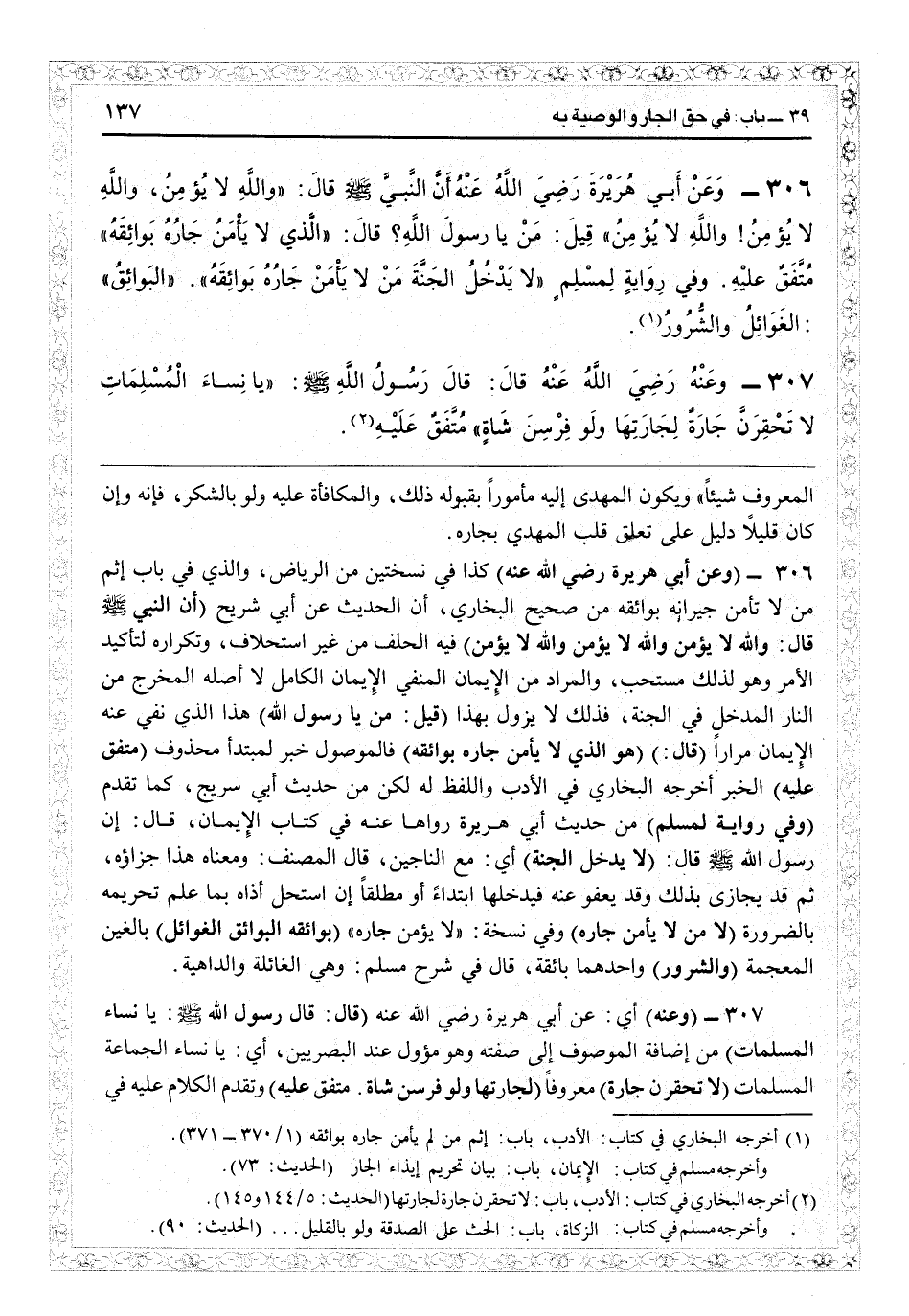 (وفي رواية لمسلم) من حديث أبي هريرة رواها عنه في كتاب الإيمان قال: إن رسول الله - صلى الله عليه وسلم - قال: (لا يدخل الجنة) أي مع الناجين، قال المصنف: ومعناه: هذا جزاؤه ثم قد يجازى بذلك وقد يعفو عنه فيدخلها ابتداء، أو مطلقاً إن استحل أذاه بما علم تحريمه بالضرورة (من لا يأمن جاره) وفي نسخة «ولا يؤمن جاره» (بوائقه. البوائق: الغوائل) بالغين المعجمة (والشرور) واحدها بائقة قال في «شرح مسلم» وهو الغائلة والداهية.