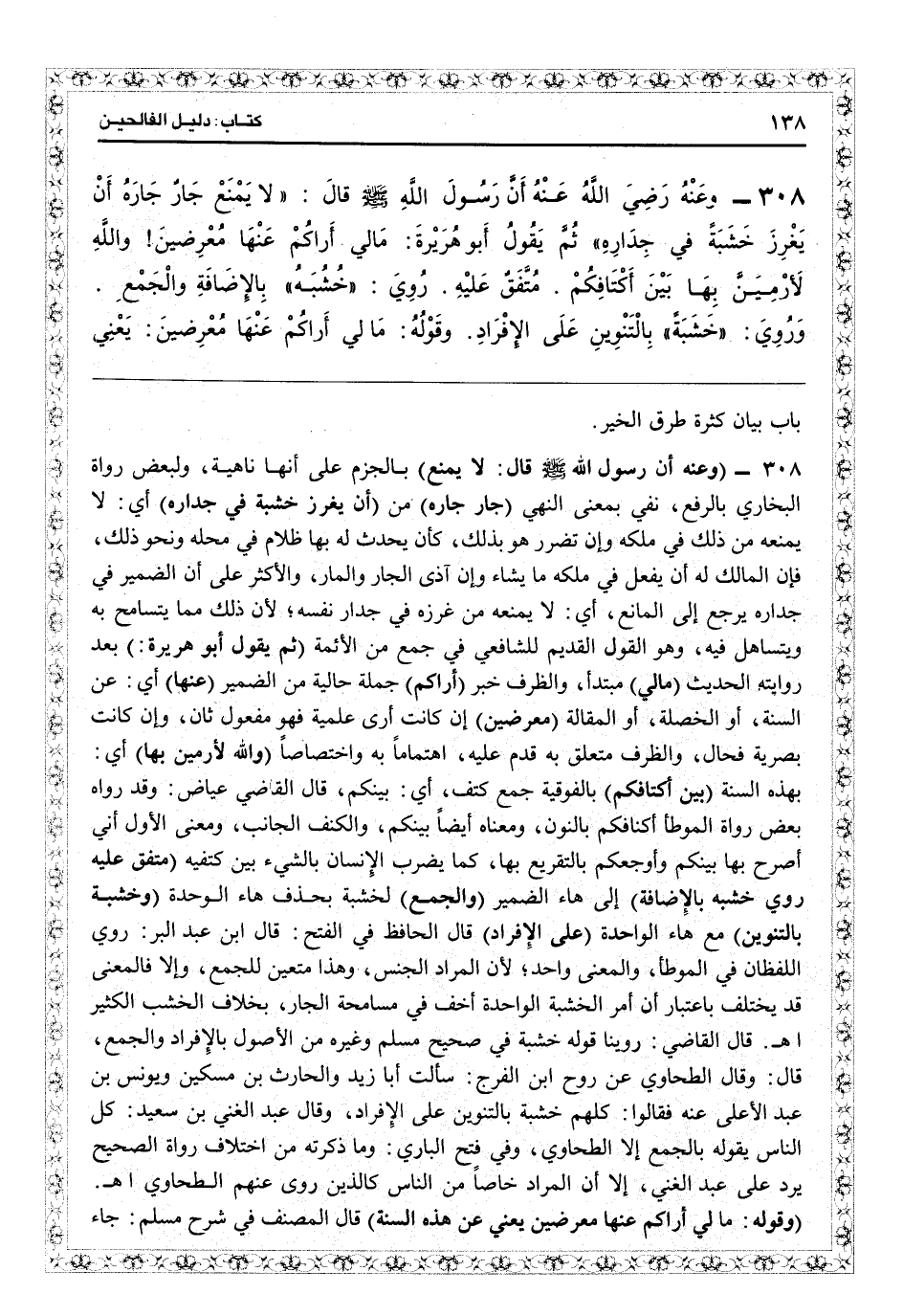 5307 - (وعنه أن رسول الله - صلى الله عليه وسلم - قال: لا يمنع) بالجزم على أنها ناهية، ولبعض رواة البخاري بالرفع: نفي بمعنى النهي (جار جاره) من (أن يغرز خشبة في جداره) أي لا يمنعه من ذلك في ملكه وإن تضررّ هو بذلك كأن يحدث له بها ظلام في محله ونحو ذلك، فإن المالك له أن يفعل في ملكه ما يشاء وإن آذى الجار والمار، والأكثر على أن الضمير في جداره يرجع إلى المانع: أي لا يمنعه من غرزه في جدار نفسه، لأن ذلك مما يتسامح به ويتساهل فيه، هو القول القديم للشافعي في جمع من الأئمة (ثم يقول أبو هريرة) بعد روايته الحديث (مالي) مبتدأ والظرف خبر (أراكم) جملة حالية من الضمير (عنها) أي عن السنة، أو الخصلة أو المقالة (معرضين) إن كانت أرى علمية فهو مفعول ثان وإن كانت بصرية فحال، والظرف متعلق به قدم عليه اهتماماً به واختصاصاً (وا لأرمين بها) أي بهذه السنة (بين أكتافكم) بالفوقية جمع كتف: أي بينكم، قال القاضي عياض وقد رواه بعض رواة الموطأ أكنافكم بالنون، ومعناه أيضاً بينكم، والكنف: الجانب، ومعنى الأول، أني أصرح بها بينكم وأوجعكم بالتقريع بها كما يضرب الإنسان بالشيء بين كتفيه (متفق عليه) .