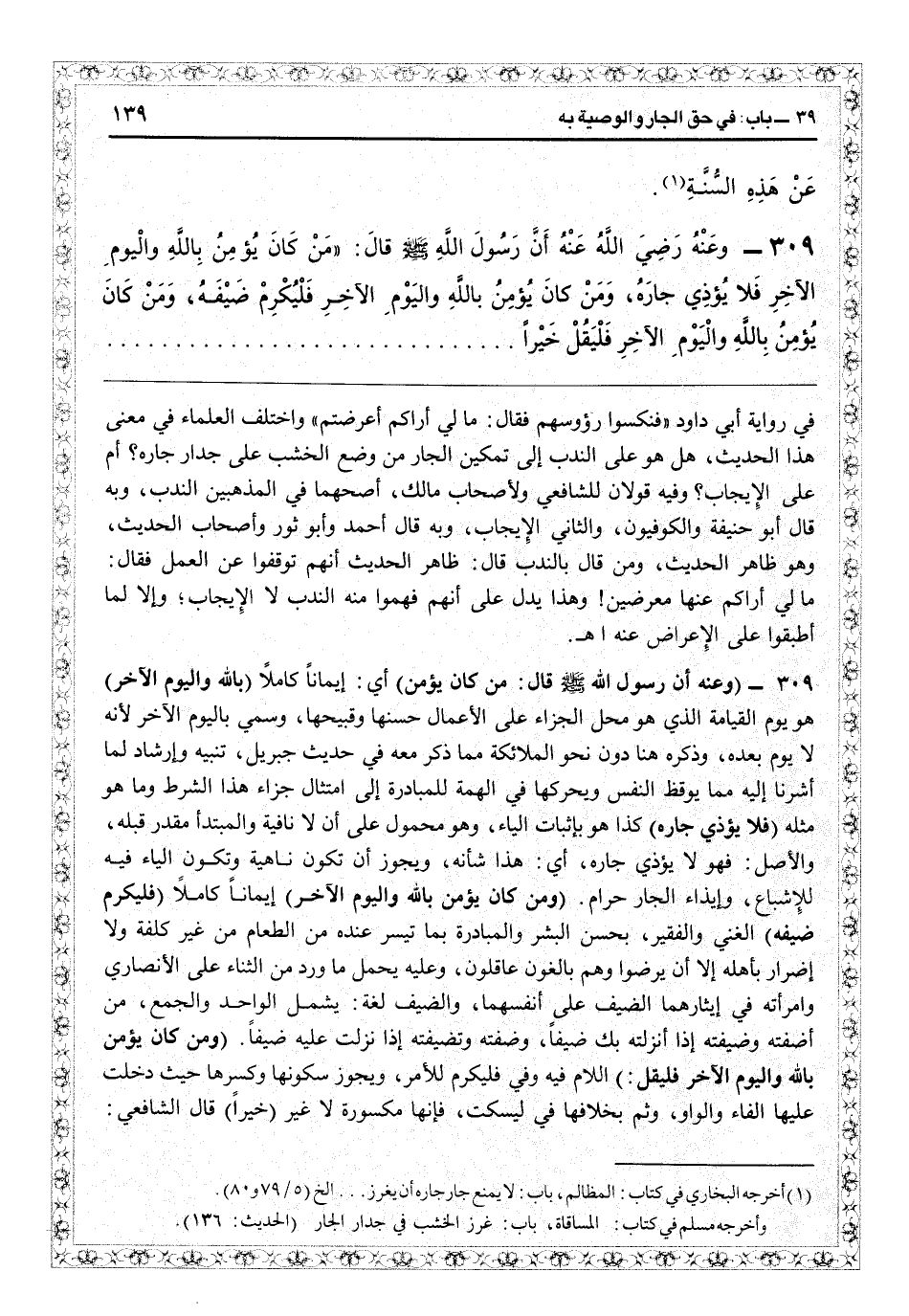 6308 - (وعنه أن رسول الله - صلى الله عليه وسلم - قال: من كان يؤمن) إيماناً كاملاً (با واليوم الآخر) هو يوم القيامة الذي هو محل الجزاء على الأعمال حسنها وقبيحها، وسمي باليوم الآخر لأنه لا يوم بعده، وذكره هنا دون نحو الملائكة مما ذكر معه في حديث جبريل تنبيه وإرشاد لما أشرنا إليه مما يوقظ النفس ويحركها في الهمة للمبادرة إلى امتثال جزاء هذا الشرط وما هو مثله (فلا يؤذي جاره) كذا هو بإثبات الباء وهو محمول على أن لا نافية والمبتدأ مقدر قبله، والأصل فهو لا يؤذي جاره: أي هذا شأنه، ويجوز أن تكون ناهية وتكون الياء فيه للإشباع، وإيذاء الجار حرام (ومن كان يؤمن با واليوم الآخر) إيماناً كاملاً (فليكرم ضيفه) الغني والفقير بحسن البشر والمبادرة بما تيسر عنده من الطعام من غير كلفة ولا إضرار بأهله إلا أن يرضوا وهم بالغون عاقلون، وعليه يحمل ما ورد من الثناء على الأنصاري وامرأته في إيثارهما الضيف على أنفسهما. والضيف لغة يشمل الواحد والجمع من أضفته وضيفته: إذا أنزلته بك ضيفاً، وضفته وتضيفته: إذا نزلت عليه ضيفاً (ومن كان يؤمن با واليوم الآخر فليقل) اللام فيه وفي فليكرم للأمر ويجوز سكونها وكسرها حيث دخلت عليها الفاء والواو وثم بخلافها في ليسكت فإنها مسكورة لا غير (خيراً) قال الشافعي: