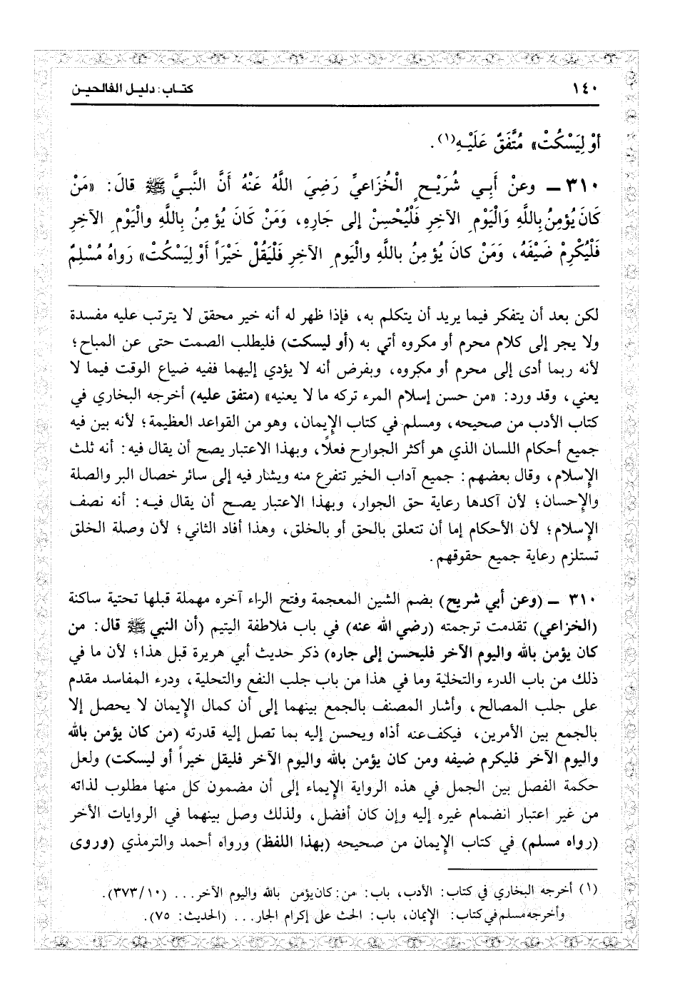 7309 - (وعن أبي شريح) بضم الشين المعجمة وفتح الراء آخره مهملة قبلها تحتية ساكنة (الخزاعي) تقدمت ترجمته (رضي الله عنه) في باب ملاطفة اليتيم (أن النبي قال: من كان يؤمن با واليوم الآخر فليحسن إلى جاره) ذكر حديث أبي هريرة قبل هذا، لأن ما في ذلك من باب الدرء والتخلية، وما في هذا من باب جلب النفع والتحلية، ودرء المفاسد مقدم على جلب المصالح، وأشار المصنف بالجمع بينهما إلى أن كمال الإيمان لا يحصل إلا بالجمع بين الأمرين، فيكفّ عنه أذاه ويحسن إليه بما تصل إليه قدرته (من كان يؤمن با واليوم الآخر فليكرم ضيفه، ومن كان يؤمن با واليوم الآخر فليقل خيراً أو ليسكت) ولعل حكمة الفصل بين الجمل في هذه الرواية الإيماء إلى أن مضمون كل منها مطلوب لذاته من غير اعتبار انضمام غيره إليه وإن كان أفضل، ولذلك وصل بينهما في الروايات الأخر (رواه مسلم) في كتاب الإيمان من «صحيحه» (بهذا اللفظ) ورواه أحمد والترمذي.