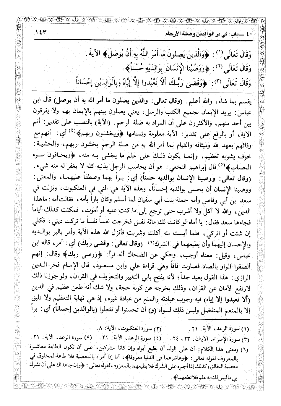 (وقال تعالى) : ( {والذين يصلون ما أمر الله به أن يوصل} ) قال ابن عباس: يريد الإيمان بجميع الكتب والرسل يعني يصلون بينهم بالإيمان بهم ولا يفرّقون بين أحد منهم، والأكثرون على أن المراد به صلة الرحم (الآية) بالنصب على تقدير أتم الآية، أو بالرفع على تقدير الآية معلومة، وتمامها {ويخشون ربهم} (الرعد: 21) أي إنهم مع وفائهم بعهد الله وميثاقه والقيام بما أمر الله به من صلة الرحم يخشون ربهم، والخشية خوف يشوبه تعظيم، وإنما يكون ذلك على علم ما يخشى به منه: {ويخافون سوء الحساب} (الرعد: 21) قال إبراهيم النخعي: هو أن يحاسب الرجل بذنبه كله لا يغفر له منه شيء.