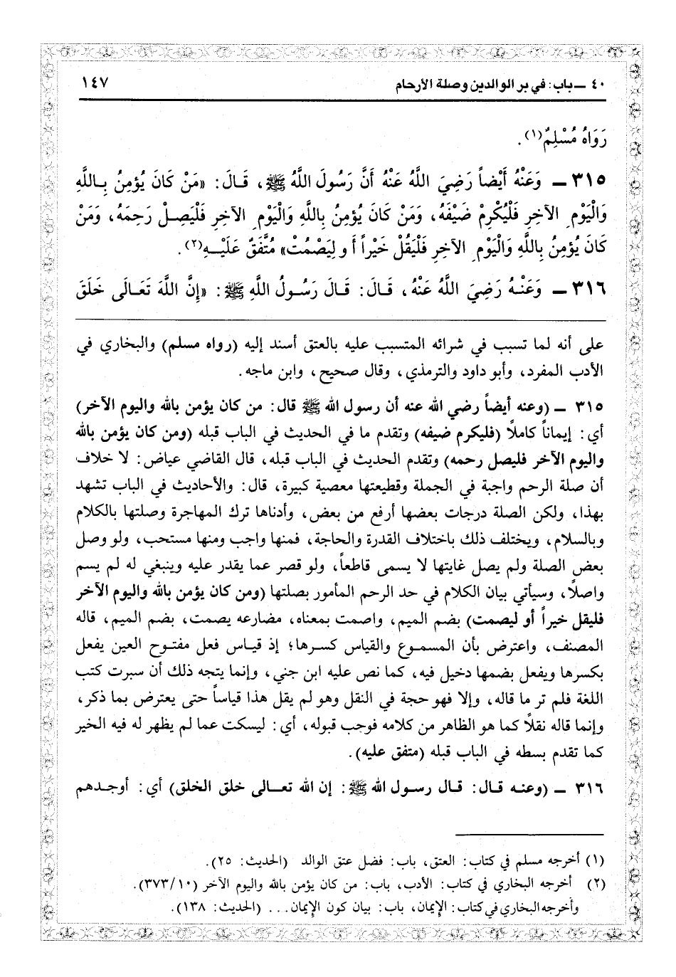 3314 - (وعنه أيضاً رضي الله عنه أن رسول الله - صلى الله عليه وسلم - قال: من كان يؤمن با واليوم الآخر) أي إيماناً كاملاً (فليكرم ضيفه) وتقدم ما في الحديث في الباب قبله (ومن كان يؤمن با واليوم الآخر فليصل رحمه) وتقدم الحديث في الباب قبله. قال القاضي عياض: لا خلاف أن صلة الرحم واجبة في الجملة وقطيعتها معصية كبيرة. قال: والأحاديث في الباب تشهد بهذا، ولكن الصلة درجات بعضها أرفع من بعض، وأدناها ترك المهاجرة وصلتها بالكلام وبالسلام. ويختلف ذلك باختلاف القدرة والحاجة: فمنها واجب ومنها مستحب، ولو وصل بعض الصلة ولم يصل غايتها لا يسمى قاطعاً، ولو قصر عما يقدر عليه وينبغي له لم يسم واصلاً، وسيأتي بيان الكلام في حد الحرم المأمور بصلتها (ومن كان يؤمن با واليوم الآخر فليقل خيراً أو ليصمت) بضم الميم، وأصمت بمعناه مضارعه يصمت بضم الميم، قاله المصنف. واعترض بأن المسموع والقياس كسرها إذ قياس فعل مفتوح العين يفعل بكسرها ويفعل بضمها دخيل فيه كما نص عليه ابن جني، وإنما يتجه ذلك إن سبرت كتب اللغة فلم تر ما قاله وإلا فهو حجة في النقل، وهو لم يقل هذا قياساً حتى يعترض بما ذكر وإنما قاله نقلاً كما هو الظاهر من كلامه فوجب قبوله: أي ليسكت عما لم يظهر له فيه الخير كما تقدم بسطه في الباب قبله (متفق عليه) .