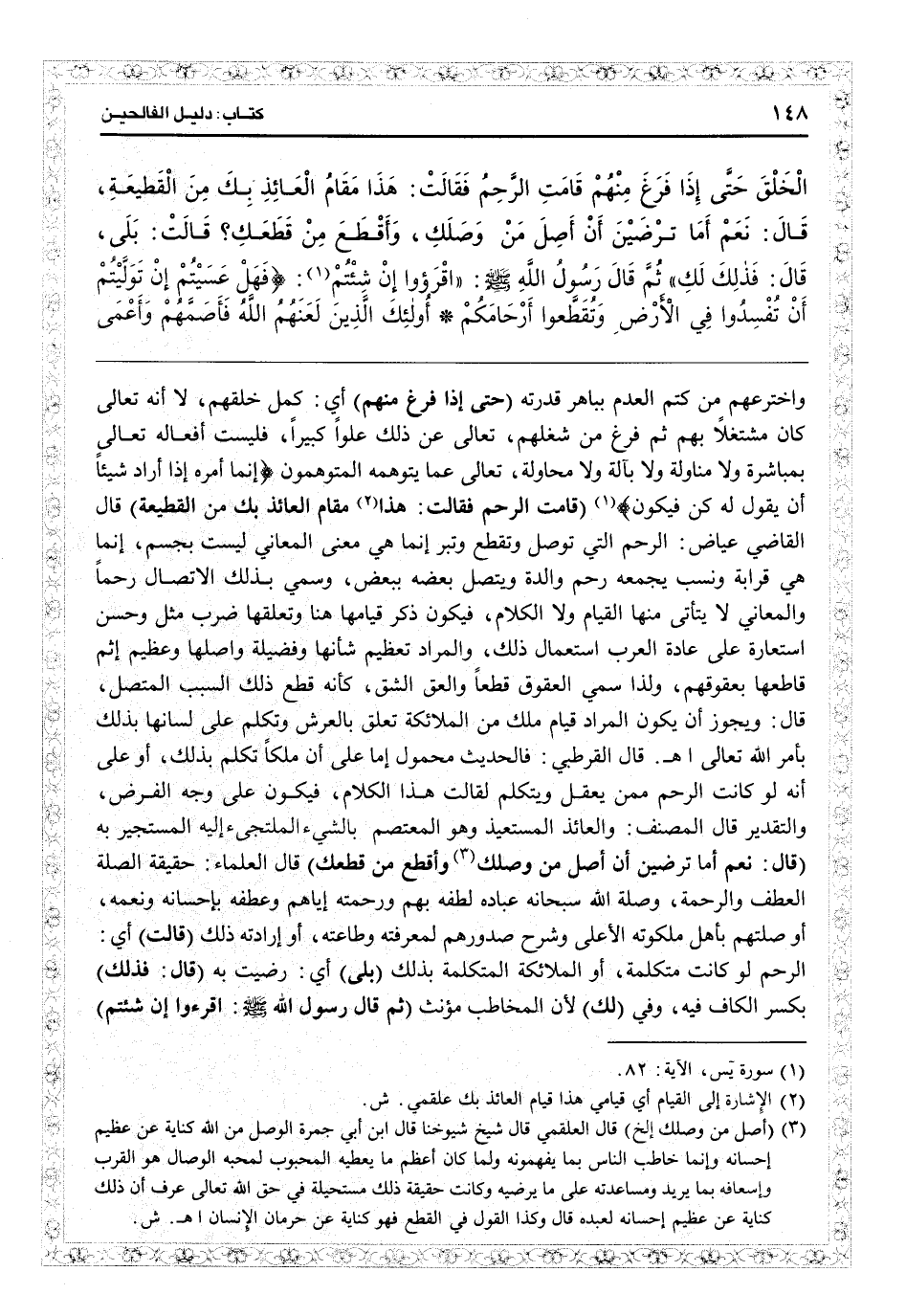 واخترعهم من كتم العدل بباهر قدرته (حتى إذا فرغ منهم) أي كمل خلقهم لا أنه تعالى كان مشتغلاً بهم ثم فرغ من شغلهم، تعالى عن ذلك علوّاً كبيراً، فليست أفعاله تعالى بمباشرة ولا مناولة ولا بآلة ولا محاولة، تعالى عما يتوهمه المتوهمون: {إنما أمره إذا أراد شيئاً أن يقول له كن فيكون} (يس: 82) (قامت الرحم فقالت: هذا مقام العائذ بك من القطيعة) قال القاضي عياض: الرحم التي توصل وتقطع وتبرّ إنما هي معنى من المعاني ليست بجسم إنما هي قرابة ونسب يجمعه رحم والدة ويتصل بعضه ببعض وسمي بذلك الاتصال رحماً، والمعاني لا يتأتى منها القيام ولا الكلام، فيكون ذكر قيامها هنا وتعلقها ضرب مثل وحسن استعارة على عادة العرب استعمال ذلك، والمراد تعظيم شأنها وفضيلة واصلها وعظيم اسم قاطعها بعقوقهم، ولذا سمي العقوق قطعاً، والعق الشق كأنه قطع ذلك السبب المتصل. قال: ويجوز أن يكون المراد قيام ملك من الملائكة تعلق بالعرش وتكلم على لسانها بذلك بأمر الله تعالى اهـ. قال القرطبي: فالحديث محمول إما على أن ملكاً تكلم بذلك، أو على أنه لو كانت الرحم ممن يعقل ويتكلم لقالت هذا الكلام، فيكون على وجه الفرض والتقدير. قال المصنف: والعائذ المستعيذ، وهو المعتصم بالشيء الملتجىء إليه المستجير به (قال: نعم، أما ترضين أن أصل من وصلك وأقطع من قطعك) قال العلماء: حقيقة الصلة العطف والرحمة، وصلة الله سبحانه عباده لطفه بهم ورحمته إياهم وعطفه بإحسانه ونعمه، أو صلتهم بأهل ملكوته الأعلى وشرح صدورهم لمعرفته وطاعته أو إرادته ذلك (قالت) أي الرحم لو كانت متكلمة أو الملائكة المتكلمة بذلك (بلى) أي رضيت به (قال فذلك) بكسر الكاف فيه وفي (لك) لأن المخاطب مؤنث (ثم قال رسول الله: اقرءوا إن شئتم)
