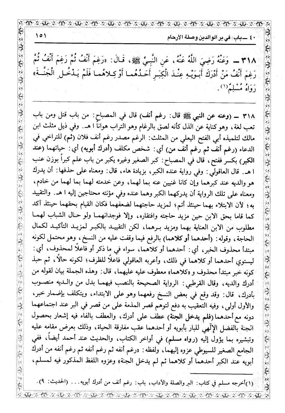 وفي ذيل مثلث ابن مالك لتلميذه أبي الفتح اليعلي من المثلث الرغم مصدر رغم أنف فلان (ثم) للتراخي في الدعاء (رغم أنف ثم رغم أنف من) أي شخص مكلف (أدرك أبويه) أي حياتهما (عند الكبر) بكسر ففتح، قال في «المصباح» : كبر الصغير وغيره يكبر من باب علم كبراً بوزن عنب اهـ. قال العاقولي: وفي رواية عنده الكبر بزيادة هاء، قال: ومعناه على حذفها أن يدرك هو والديه عند كبرهما وإن كانا غنيين عنه بمالهما وعن خدمته لهما بمالهما من خادم ومعناه على تلك الرواية: أن يدركهما الكبر وهما عنده وفي مؤنثه محتاجين إليه اهـ. والتقييد به لأن الابتلاء بهما حينئذٍ أتمّ لمزيد حاجتهما لضعفهما، فكان القيام بحقهما حينئذٍ آكد كما قاما بحق الابن حين زيد حاجته وافتقاره، وإلا فوجدانهما ولو حال الشباب لهما مطلوب من الابن العناية بهما ومزيد برّهما، لكن التقييد بالكبر لمزيد التأكيد لكمال الحاجة، وقوله (أحدهما أو كلاهما) بالرفع فيما وقفت عليه من النسخ وهو محتمل لكونه مبتدأ محذوف الخبر: أي أحدهما أو كلاهما سواء فيما ذكر أو فاعلاً لمحذوف: أي ليستوي أحدهما أو كلاهما في ذلك، وأعربه العاقولي فاعلاً للظرف لكونه حالاً ثم حبذا كونه خبر مبتدأ محذوف، و «كلاهما» معطوف عليه عليهما، قال: وهذه الجملة بيان لقوله: «من أدرك والديه» وقال القرطبي: الرواية الصحيحة بالنصب فيهما بدل من والديه منصوب بأدرك، قال: وقد وقع في بعض النسخ رفعهما وهو على الابتداء ويتكلف بإضمار خبر، والأوّل أولى، وفيه التعقيب به دفع لتوهم قصر المذمة على من قصّر في البر عند اجتماعهما دونه مع أحدها (فلم يدخل الجنة) عطف على أدرك، والعطف بالفاء فيه إشعار بحصول الجنة بالفضل الإلهي للبارّ بأبويه أو أحدهما عقب مفارقة الحياة، وذلك بعرض مقامه عليه وتبشيره بما يؤول إليه (رواه مسلم) في أواخر الكتاب والحديث عند أحمد أيضاً، ففي «الجامع الصغير» للسيوطي عزوه إليهما ولفظه «رغم أنفه ثم رغم