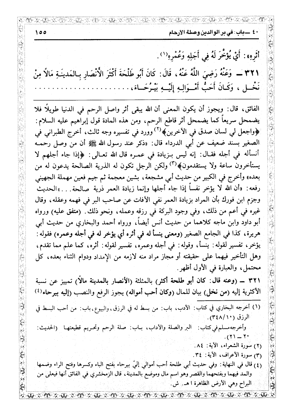 الفائق، قال: ويجوز أن يكون المعنى: أن الله يبقي أثر واصل الرحم في الدنيا طويلاً فلا يضمحلّ سريعاً كما يضمحل أثر قاطع الرحم، ومن هذه المادة قول إبراهيم عليه السلام: {واجعل لي لسان صدق في الآخرين} (الشعراء: 84) وورد في تفسيره وجه ثالث أخرج الطبراني في «الصغير» بسند ضعيف عن أبي الدرداء قال: «ذكر عند رسول الله - صلى الله عليه وسلم - أن من وصل رحمه أنسأ له في أجله، فقال: إنه ليس زيادة في عمره قال الله تعالى: {إذا جاء أجلهم لا يستأخرون ساعة ولا يستقدمون} (الأعراف: 34) ولكن الرجل تكون له الذرية الصالحة يدعون له من بعده» وأخرج في الكبير من حديث أبي مشجعة بشين معجمة ثم صالحة» الحديث. وجزم به ابن فورك بأن المراد بزيادة العمر نفي الآفات عن صاحب البر في فهمه وعقله. وقال غيره: في أعم من ذلك وفي وجود البركة في رزقه وعمله ونحو ذلك (متفق عليه) ورواه أبو داود وابن ماجه كلاهما من حديث أنس أيضاً ورواه أحمد والبخاري من حديث أبي هريرة، كذا في «الجامع الصغير» (ومعنى ينسأ له في أثره: أي يؤخر له في أجله وعمره) فقوله: يؤخر تفسير لقوله ينسأ، وقوله في أجله وعمره وتفسير لقوله أثره كما علم مما تقدم، وهل التأخير فيهما على حقيقته أو مجاز مراد منه لازمه من الإمداد ودوام الثناء بعده؟ كل محتمل والعبارة في الأول أظهر.