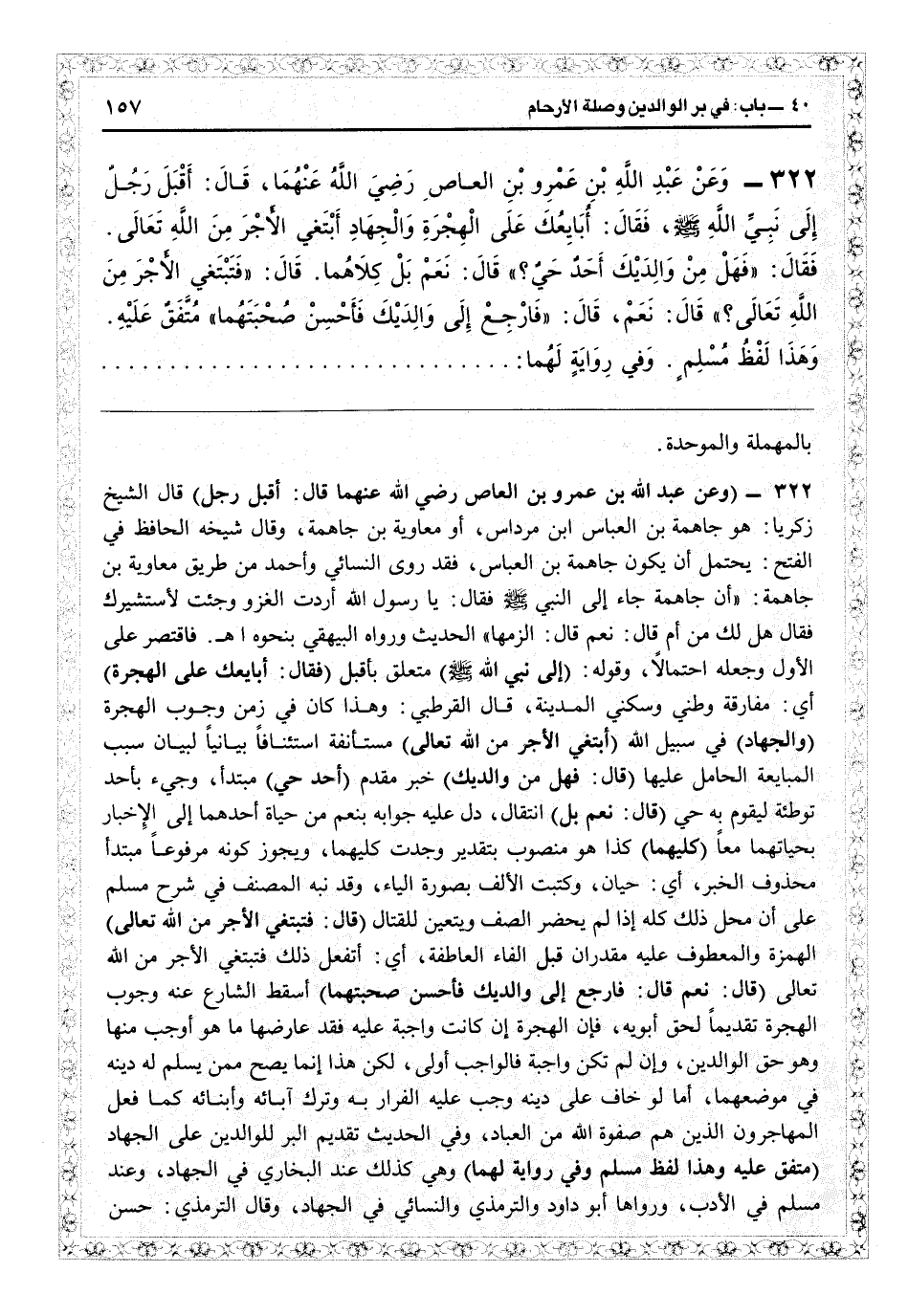 10321 - (وعن عبد الله بن عمرو بن العاص رضي الله عنهما قال: أقبل رجل) قال الشيخ زكريا: هو جاهمة بن العباس بن مرداس، أو معاوية بن جاهمة. وقال شيخه الحافظ في «الفتح» : يحتمل أن يكون جاهمة بن العباس، فقد روى النسائي وأحمد من طريق معاوية بن جاهمة: «أن جاهمة جاء إلى النبي فقال: يا رسول الله أردت الغزو وجئت لأستشيرك، فقال: هل لك من أمّ؟ قال: نعم، قال: الزمها» الحديث، ورواه البيهقي بنحوه اهـ. فاقتصر على الأوّل وجعله احتمالاً، وقوله: (إلى نبي الله) متعلق بأقبل (فقال: أبايعك على الهجرة) أي مفارقة وطني وسكني المدينة. قال القرطبي: وهذا كان في زمن وجوب الهجرة (والجهاد) في سبيل الله (أبتغي الأجر من الله تعالى) مستأنفة استئنافاً بيانياً لبيان سبب المبايعة الحامل عليها (قال: فهل من والديك) خبر مقدم (أحد حيّ) مبتدأ وجيء بأحد توطئة ليقوم به حتى (قال: نعم، بل) انتقال دلّ عليه جوابه بنعم من حياة أحدهما إلى الإخبار بحياتهما معاً (كليهما) كذا هو منصوب بتقدير وجدت كليهما، ويجوز كونه مرفوعاً مبتدأ محذوف الخبر: أي حيان وكتبت الألف بصورة الياء، وقد نبه المصنف في شرح مسلم على أن محل ذلك كله إذا لم يحضر الصف ويتعين للقتال (قال: فتبتغي الأجر من الله تعالى؟) الهمزة والمعطوف عليه مقدران قبل الفاء العاطفة: أي أتفعل ذلك فتبتغي الأجر من الله تعالى: (قال: نعم، قال: فارجع إلى والديك فأحسن صحبتهما) أسقط الشارع عنه وجوب الهجرة تقديماً لحق أبويه، فإن الهجرة إن كانت واجبة عليه فقد عارضها ما هو أوجب منها وهو حق الوالدين، وإن لم تكن واجبة فالواجب أولى، لكن هذا إنما يصح ممن يسلم له دينه في موضعهما، أما لو خاف على دينه وجب عليه الفرار به وترك آبائه وأبنائه كما فعل المهاجرون الذين هم صفوة الله من العباد. وفي الحديث تقديم البرّ للوالدين على الجهاد (متفق عليه، وهذا لفظ مسلم) .