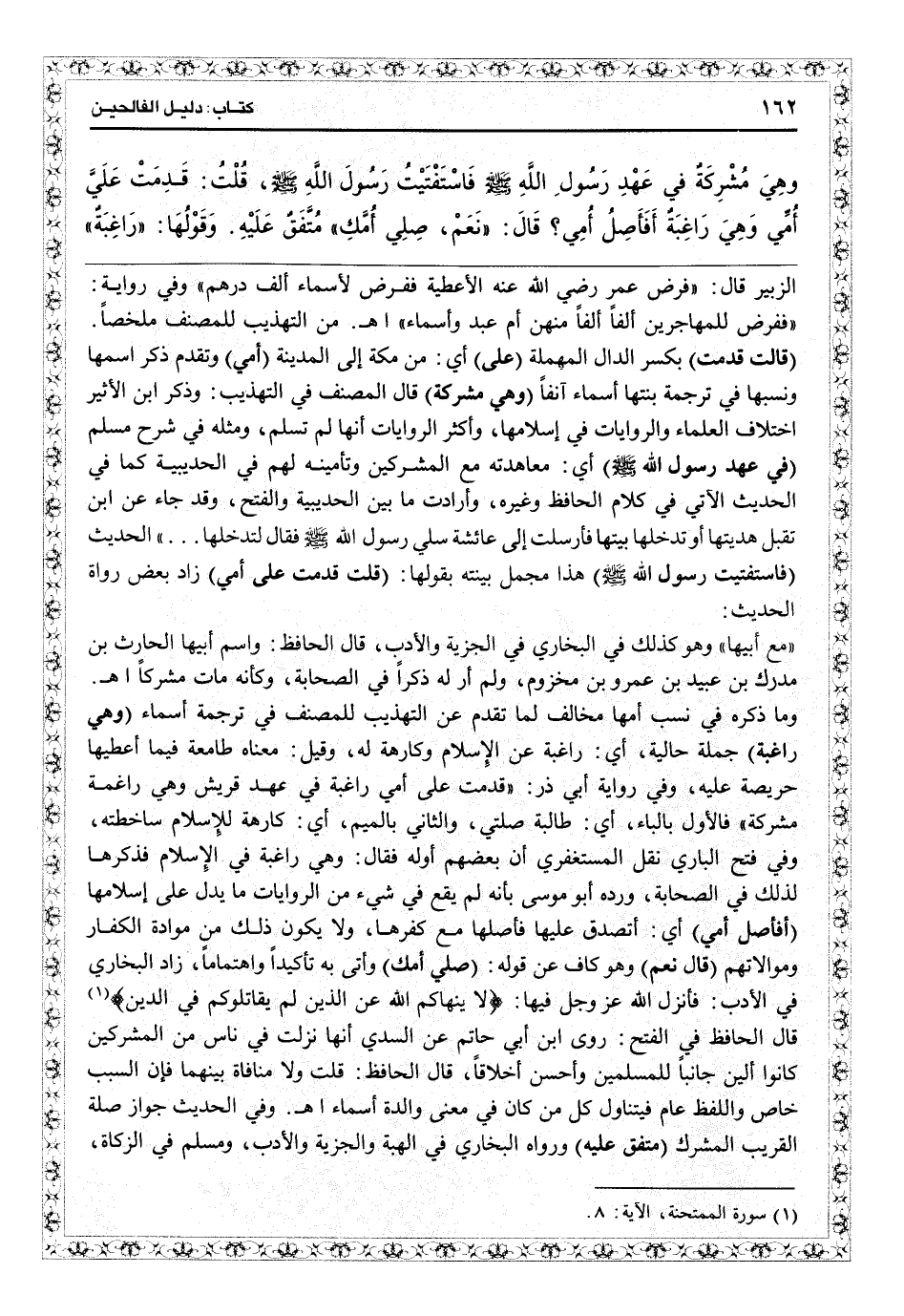 {لا ينهاكم الله عن الذين لم يقاتلوكم في الدين} (الممتحنة: 8) » قال الحافظ في «الفتح» : روى ابن أبي حاتم عن السدي أنها نزلت في ناس من المشركين كانوا ألين جانباً للمسلمين وأحسن أخلاقاً. قال الحافظ: قلت ولا منافاة بينهما، فإن السبب خاص واللفظ عام، فيتناول كل من كان في معنى والدة أسماء اهـ. وفي الحديث جواز صلة القريب المشرك (متفق عليه) ورواه البخاري في الهبة والجزية والأدب، ومسلم في الزكاة