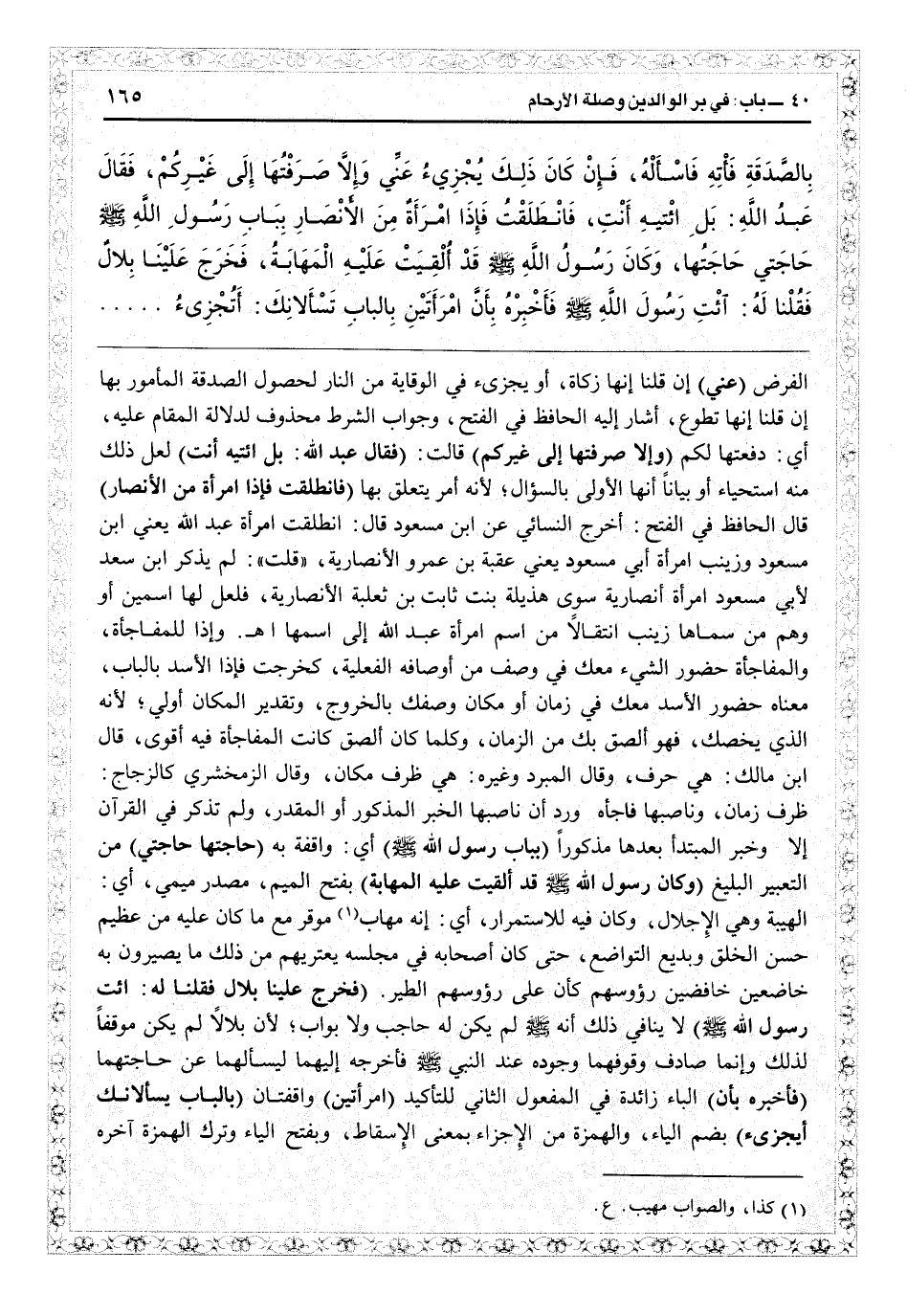 إليه الحافظ في «الفتح» ، وجواب الشرط محذوف لدلالة المقام عليه: أي دفعتها لكم (وإلا صرفتها إلى غيركم) قالت (فقال عبد الله: بل ائتيه أنت) لعل ذلك منه استحياء أو بيان أنها الأولى بالسؤال لأنه أمر يتعلق بها (فانطلقت فإذا امرأة من الأنصار) قال الحافظ في «الفتح» : أخرج النسائي عن ابن مسعود قال: «انطلقت امرأة عبد الله: يعني ابن مسعود، وزينب امرأة أبي مسعود: يعني عقبة بن عمرو الأنصارية» قلت: لم يذكر ابن سعد لأبي مسعود امرأة أنصارية سوى هذيلة بنت ثابت بن ثعلبة الأنصارية فلعل لها اسمين، أو وهم من سماها زينب انتقالاً من اسم امرأة عبد الله إلى اسمها اهـ. وإذا للمفاجأة، والمفاجأة حضور الشيء معك في وصف من أوصافه الفعلية كخرجت فإذا الأسد بالباب، معناه حضور الأسد معك في زمان أو مكان وصفك بالخروج، وتقدير المكان أولى لأنه الذي يخصك فهو ألصق بك من الزمان، وكلما كان ألصق كانت المفاجأة فيه أقوى. قال ابن مالك: هي حرف، وقال المبرد وغيره: هي ظرف مكان، وقال الزمخشري كالزجاج: ظرف زمان وناصبها فاجأه، وردّ أن ناصبها الخبر المذكور أو المقدر ولم تذكر في القرآن إلا وخبر المبتدأ بعدها مذكوراً (بباب رسول الله) أي واقفة به (حاجتها حاجتي) من التعبير البليغ (وكان رسول الله - صلى الله عليه وسلم - قد ألقيت عليه المهابة) بفتح الميم مصدر ميمي: أي الهيبة وهي الإجلال وكان فيه للاستمرار: أي إنه مهاب موقر مع ما كان عليه من عظيم حسن الخلق وبديع التواضع حتى كان أصحابه في مجلسه يعتريهم من ذلك ما يصيرون به خاضعين خافضين رؤوسهم كأن على رؤوسهم الطير (فخرج علينا بلال فقلنا له: ائت رسول الله) لا ينافي ذلك أنه لم يكن له حاجب ولا بواب، لأن بلالاً لم يكن موقفاً لذلك، وإنما صادف وقوفهما وجوده عند النبيّ، فأخرجه إليهما ليسألهما عن حاجتهما (فأخبره بأن) الباء زائدة في المفعول الثاني للتأكيد (امرأتين) واقفتان (بالباب يسألانك أيجزىء) بضم