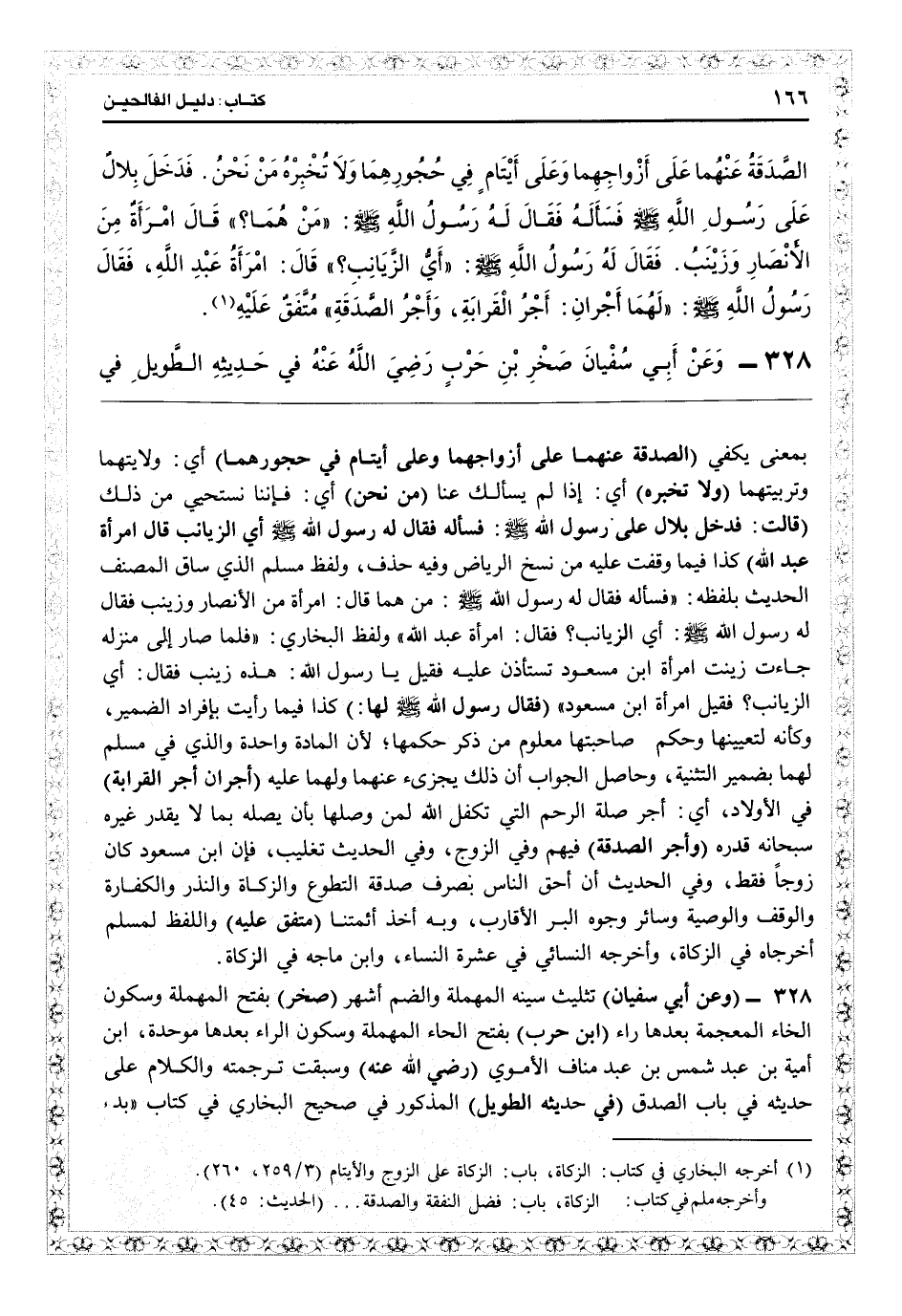 بمعنى يكفي (الصدقة عنهما على أزواجهما وعلى أيتام في حجورهما) أي ولايتهما وتربيتهما (ولا تخبره) أي إذا لم يسألك عنا (من نحن) أي فإننا نستحيي من ذلك (قالت: فدخل بلال على رسول الله - صلى الله عليه وسلم - فسأله، فقال له رسول الله: أي الزيانب؟ قال: امرأة عبد ا) كذا فيما وقفت عليه من نسخ الرياض، وفيه حذف، ولفظ مسلم الذي ساق المصنف الحديث بلفظه «فسأله فقال له رسول الله: من هما؟ قال: امرأة من الأنصار وزينب، فقال له رسول الله: أي الزيانب؟ فقال: امرأة عبد ا» ولفظ البخاري «فلما صار إلى منزله جاءت زينب امرأة ابن مسعود تستأذن عليه، فقيل: يا رسول الله هذه زينب فقال: أي الزيانب؟ فقيل: امرأة ابن مسعود» (فقال رسول الله - صلى الله عليه وسلم - لها) كذا فيما رأيت بإفراد الضمير وكأنه لتعيينها وحكم صاحبتها معلوم من ذكر حكمها لأن المادة واحدة، والذي في مسلم لهما بضمير التثنية. وحاصل الجواب أن ذلك يجزىء عنهما، ولهما عليه (أجران: أجر القرابة) في الأولاد: أي أجر صلة الرحم التي تكفل الله لمن وصلها بأن يصله بما لا يقدر غيره سبحانه قدره (وأجر الصدقة) فيهم وفي الزوج. وفي الحديث تغليب، فإن ابن مسعود كان زوجاً فقط، وفي الحديث «إن أحق الناس بصرف صدقة التطوّع والزكاة والنذر والكفارة والوقف والوصية وسائر وجوه البرّ الأقارب» وبه أخذ أئمتنا (متفق عليه) واللفظ لمسلم أخرجاه في الزكاة وأخرجه النسائي في عشرة النساء وابن ماجه في الزكاة.
