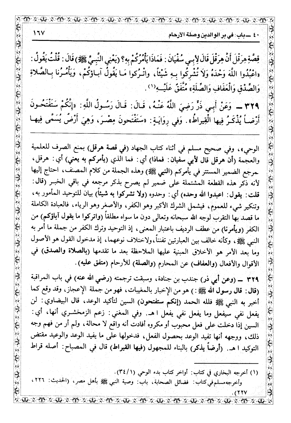 الوحي، وفي «صحيح مسلم» في أثناء كتاب الجهاد (في قصة هرقل) بمنع الصرف للعلمية والعجمة (أن هرقل قال لأبي سفيان: فماذا) أي فما الذي (يأمركم به، يعني) أي هرقل بمرجع الضمير المستتر في أمركم (النبيّ) وهذه الجملة من كلام المصنف احتاج إلها، لأنه ذكر هذه القطعة المشتملة على ضمير لم يصرح بذكر مرجعه في باقي الخبر (قال: قلت يقول اعبدوا الله وحده) أي وحدوه (ولا تشركوا به شيئاً) بيان للتوحيد المأمور به وتنكير شيء للعمم، فيشمل الشرك الأكبر وهو الكفر، والأصغر وهو الرياء، فالعبادة الكاملة ما قصد بها لتقرّب لوجه الله سبحانه وتعالى دون ما سواه مطلقاً (واتركوا ما يقول آباؤكم) من الكفر (ويأمرنا) من عطف الرديف باعتبار المعنى: إذ التوحيد وترك الكفر من جملة ما أمر به النبيّ، وكأنه خالف بين العبارتين تفنناً ولاختلاف نوعهما إذ مدخول القول هو الأصول وما بعد الأمر هو الأخلاق المبنية عليها الملاحظة بعد ما تقدمها (بالصلاة والصدق) في الأقوال والأفعال (والعفاف) عن المحارم (والصلة) للأرحام (متفق عليه) .