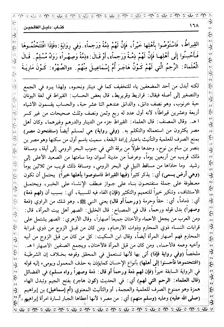 لكنه أبدل من أحد المضعفين ياء للتخفيف كما في دينار ونحوه، ولهذا يرد في الجمع والتصغير إلى أصله فيقال قراريط وقريرط. قال بعض الحسَّاب: القيراط في لغة اليونان حبة خرنوب، وهو نصف دانق، والدانق عندهم اثنا عشر حبة، والحسَّاب يقسمون الأشياء أربعة وعشرين قيراطاً لأنه أول عدد له ربع وثمن ونصف وثلث صحيحات من غير كسر اهـ. وقال المصنف: قال العلماء: القيراط جزء من الدينار والدرهم وغيرهما، وكان أهل مصر يكثرون من استعماله والتكلم به (وفي رواية) هي لمسلم أيضاً (ستفتحون مصر) بمنع الصرف للعلمية والتأنيث باعتبار إرادة البقعة؛ سميت باسم أول من سكنها وهو مصر بن بنصر بن سام بن نوح. وحدّها طولاً من برقة التي في جنوب البحر الرومي إلى أيلة، ومسافة ذلك قريب من أربعين يوماً، وعرضاً من مدينة أسوان وما سامتها من الصعيد الأعلى إلى رشيد وما حاذاها من مساقط النيل في البحر الرومي، ومسافة ذلك قريب من ثلاثين يوماً (وهي أرض يسمى) أي يذكر كثيراً (فيها القيراط فاستوصوا بأهلها خيراً) يحتمل أن تكون معطوفة على جملة ستفتحون بناء على جواز عطف الإنشاء على الخبر، ويحتمل الاستئناف وتنكير خيراً للتعميم والتكثير (فإن) الفاء فيه للسببية: أي بسبب أن (لهم ذمة) أي ذماماً: أي حقاً