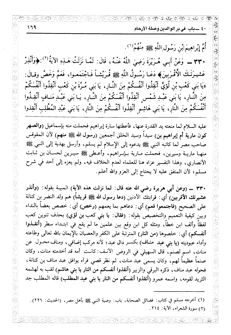 18329 - (وعن أبي هريرة رضي الله عنه قال: لما نزلت هذه الآية) المبينة بقوله: (وأنذر عشيرتك الأقربين) أي قرابتك الأدنين (دعا رسول الله - صلى الله عليه وسلم - قريشاً) هم ولد النضر بن كنانة على الصحيح (فاجتمعوا فعم) أي دعاهم بما يعمهم (وخص) أي خصيص بعضاً بالنداء وبين كيفية التعميم والتخصيص بقوله: (فقال: يا بني كعب بن لؤي) بحذف تنوين كعب لفظاً وألف ابن خطاً، ومثله كان ابن وقع بين علمين ما لم يقع في ابتداء سطر (أنقذوا أنفسكم) أي خلصوها (من النار) المترتبة على الكفر والعصيان بالإيمان با تعالى وطاعته وأداء عبوديته (يا بني عبد مناف) بكسر دال عبد لأنه مركب إضافي ومناف محول عن منات اسم لصنم. قال السهيلي في «الروض الأنف» : كانت أمه قد أخدمته منات وكان صنماً عظيماً لهم وكان يسمى عبد منات، ثم نظر قصيّ فرآه يوافق عبد مناف بن كنانة فحوله عبد مناف. ذكره البرقي والزبير (انقذوا أنفسكم من النار، يا بني هاشم) لقب به لهشمه الثريد لقومه، واسمه عمرو (أنقذوا أنفسكم من النار يا بني عبد المطلب) قاله المطلب جد