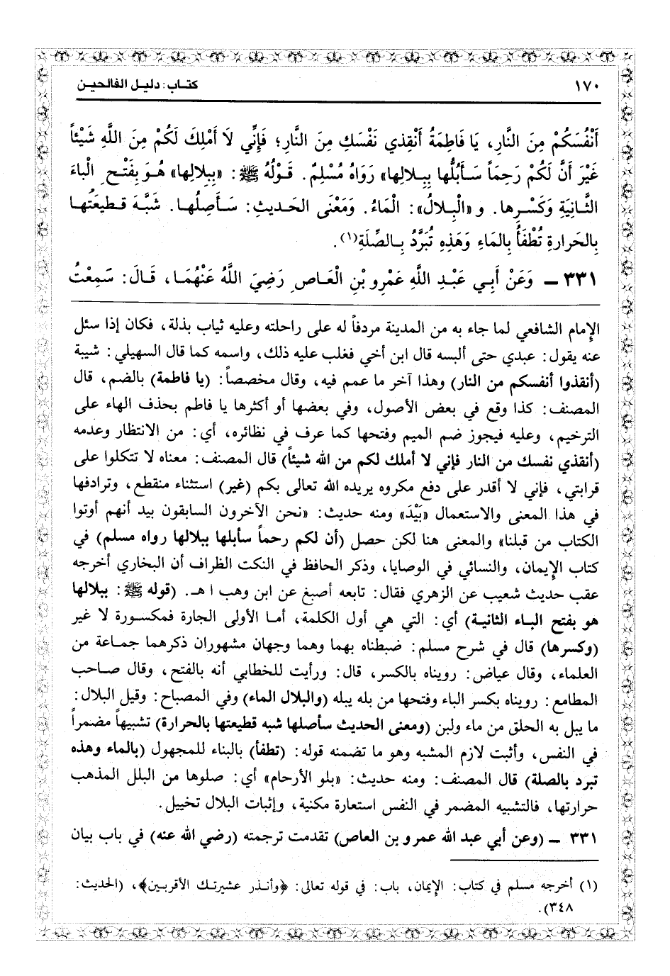 ببلالها. رواه مسلم) في كتاب الإيمان والنسائي في الوصايا، وذكر الحافظ في «النكت الظراف» أن البخاري أخرجه عقب حديث شعيب عن الزهري فقال: تابعه أصبغ عن ابن وهب اهـ. (قوله: ببلالها هو بفتح الباء الثانية) أي التي هي أول الكلمة، أما الأولى الجارة فمكسورة لا غير (وكسرها) قال في شرح مسلم: ضبطناه بهما وهما وجهان مشهوران ذكرهما جماعة من العلماء. وقال عياض: رويناه بالكسر قال: ورأيت في الخطابي أنه بالفتح، وقال صاحب «المطالع» : رويناه بكسر الباء وفتحها من بل يبله (والبلال الماء) وفي «المصباح» : وقيل البلال ما يبل به الحلق من ماء ولبن (ومعنى الحديث سأصلها، شبه قطيعتها بالحرارة) تشبيهاً مضمراً في النفس وأثبت لازم المشبه وهو ما تضمنه قوله (تطفأ) بالبناء للمجهول (بالماء وهذه تبرد بالصلة) قال المصنف: ومنه حديث «بلوا الأرحام» أي صلوها، من البلل المذهب حرارتها فالتشبيه المضمر في النفس استعارة مكنية وإثبات البلال تخييل.