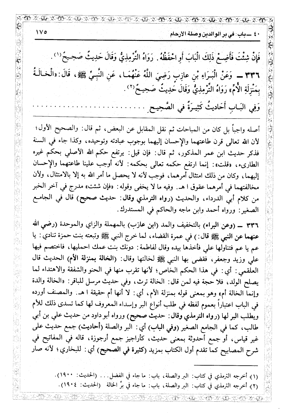 24335 - (وعن البراء) بالتخفيف والمد (ابن عازب) بالمهملة والزاي والموحدة (رضي الله عنهما عن النبيّ قال) في عمرة القضاء «لما خرج النبيّ وتبعته بنت حمزة تنادي يا عم يا عم، فتناولها عليّ فأخذها بيده وقال لفاطمة: دونك بنت عمك احمليها، فاختصر فيها عليّ وزيد وجعفر، فقضى بها النبيّ لخالتها وقال (الخالة بمنزلة الأم) الحديث. قال العلقمي: أي في هذا الحكم الخاص لأنها تقرب منها في الحنوّ والشفقة والاهتداء لما يصلح الولد فلا حجة فيه لمن قال: الخالة ترث. وفي حديث مرسل للباقر «الخالة والدة، وإنما الخالة أمّ - وهو بمعنى قوله: «بمنزلة الأم» أي لا أنها أم حقيقة اهـ. والمصنف أورده في الباب اعتباراً بعموم لفظه في طلب أنواع البرّ وإسداء المعروف لها كما تسدى ذلك للأم مطلب البرّ لها (رواه الترمذي وقال: حديث صحيح) ورواه أبو داود من حديث عليّ بن أبي طالب كما في «الجامع الصغير» (وفي الباب) أي البرّ والصلة (أحاديث) مع حديث عليّ بن أبي طالب كما في «الجامع الصغير» (وفي الباب) أي البرّ والصلة (أحاديث) جمع حديث على غير قياس أو جمع أحدوثة بمعنى حديث كأراجيز جمع أرجوزة، قاله في «المفاتيح في شرح المصابيح» كما تقدم أوّل الكتاب بمزيد (كثيرة في الصحيح) أي للبخاري لأنه صار