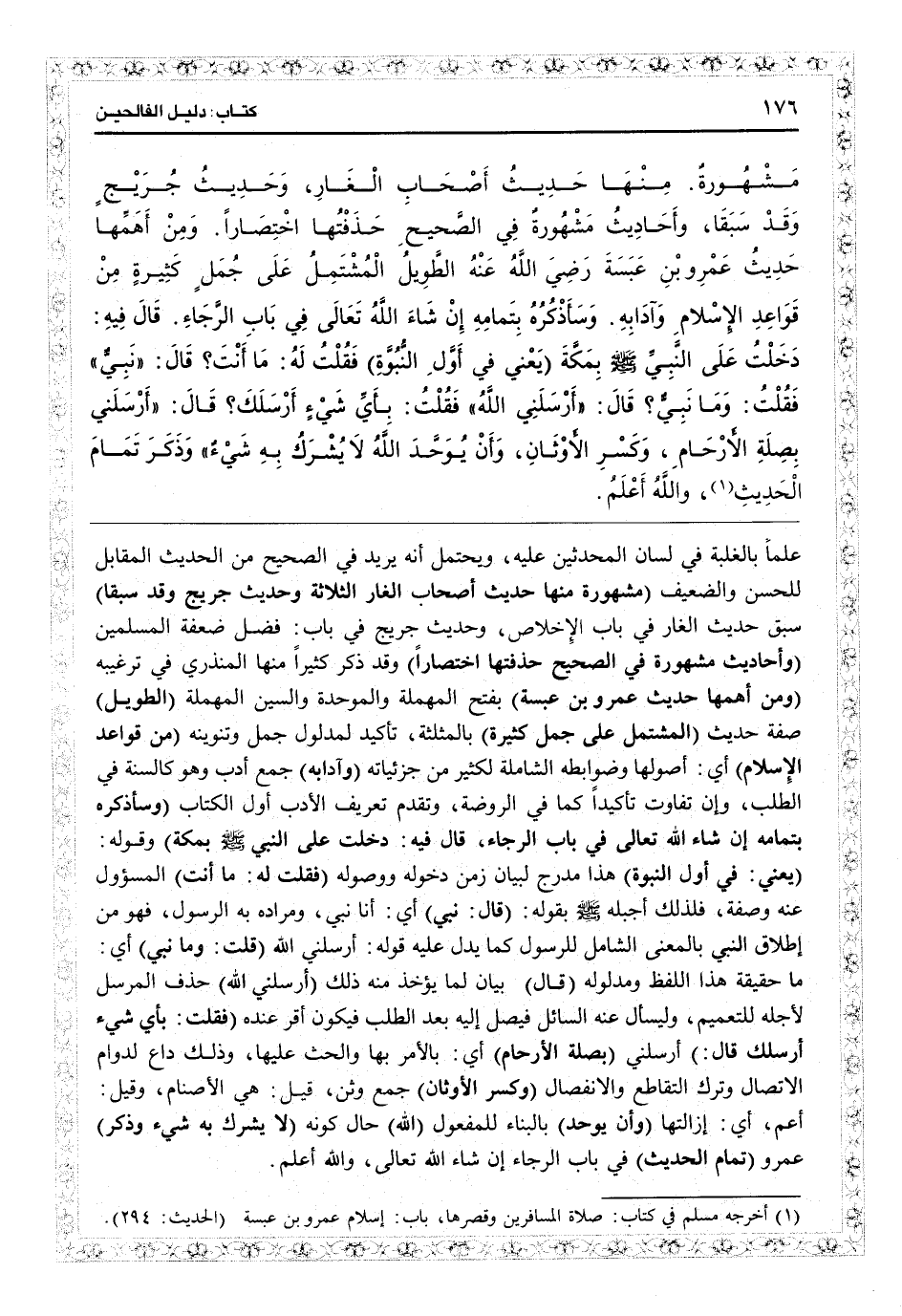 علماً بالغلبة في لسان المحدثين عليه، ويحتمل أنه يريد في الصحيح من الحديث للقابل للحسن والضعيف (مشهورة منها حديث أصحاب الغار الثلاثة وحديث جريج وقد سبقا) سبق حديث الغار في باب الإخلاص وحديث جريج في باب فضل ضعفة المسلمين (وأحاديث مشهورة في الصحيح حذفتها اختصاراً) وقد ذكرا كثيراً منها المنذري في «ترغيبه» (ومن أهمها حديث عمرو بن عبسة) بفتح المهملة والموحدة والسين المهملة (رضي الله عنه الطويل) صفة حديث (المشتمل على جمل كثيرة) بالمثلثة تأكيد لمدلول جمل وتنوينه (من قواعد الإسلام) أي أصوله وضوابطه الشاملة لكثير من جزئياته (وآدابه) جمع أدب وهو