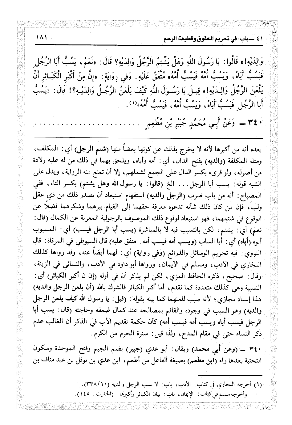 (وفي رواية) أي لهما أيضاً عنه وقد رواها كذلك البخاري في الأدب ومسلم في الإيمان ورواها أبو داود في الأدب والنسائي في الزينة وقال: صحيح، ذكره الحافظ المزي، لكن لم يذكر أن في قوله: (إن من أكبر الكبائر) أي النسبية وهي كذلك متعددة كما تقدم، أما أكبر الكبائر فالشرك با (أن يلعن الرجل والديه) وهو السبب في وجوده والقائم بمصالحه عند كمال ضعفه وحاجته (قال: يسبّ أبا الرجل فيسبّ أباه، ويسبّ أمه فيسبّ أمه) كأن حكمة تقديم الأب في الذكر أن الغالب عدم ذكر النساء حتى في مقام المدح، ولذا قيل: سترة الحرم من الكرم.