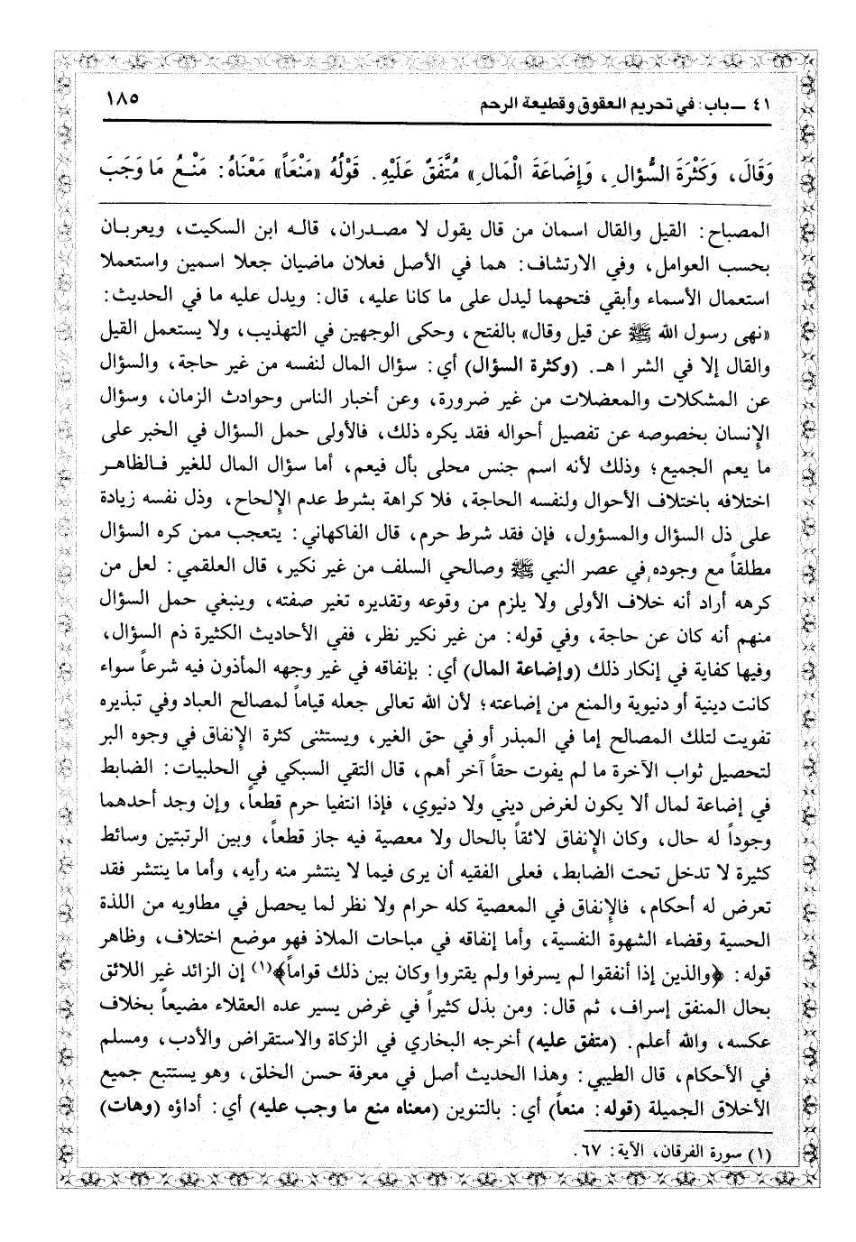 {والذين إذا أنفقوا لم يسرفوا ولم يقتروا وكان بين ذلك قواماً} (الفرقان: 67) أن الزائد غير اللائق بحال المنفق إسراف، ثم قال: ومن بذل كثيراً في غرض يسير عده العقلاء مضيعاً بخلاف عكسه، والله أعلم. (متفق عليه) أخرجه البخاري في الزكاة والاستقراض والأدب، ومسلم في الأحكام، قال الطيبي: وهذا الحديث أصل في معرفة حسن الخلق وهو يستتبع جميع الأخلاق الجميلة (قوله منعاً) أي بالتنوين (معناه منع ما وجب عليه) أي أداؤه (وهات)