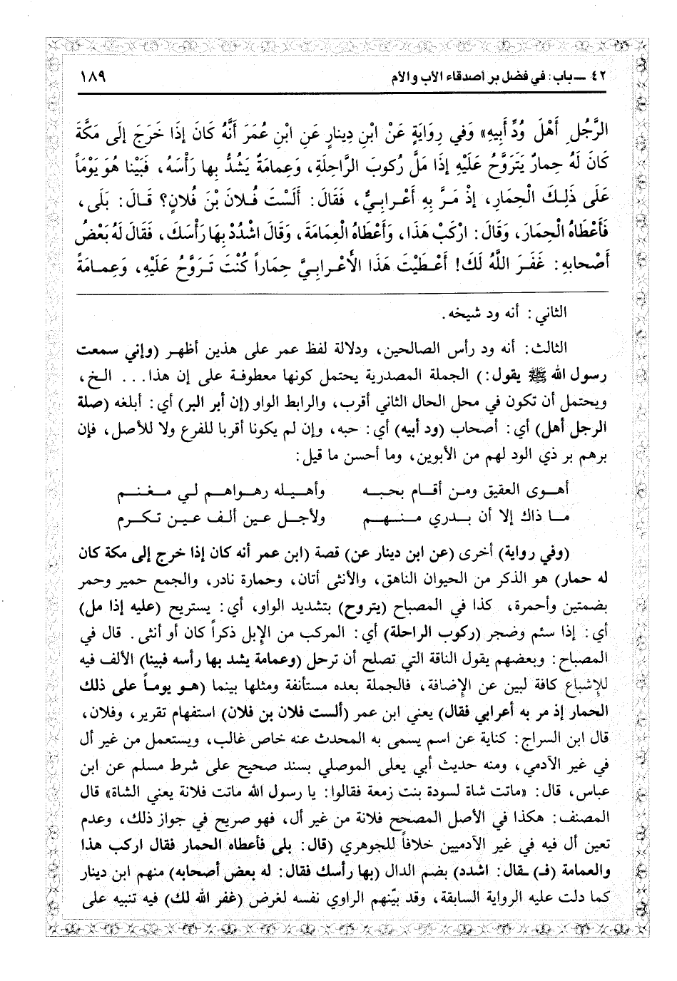 (وفي رواية) أخرى (عن ابن دينار عن) قصة (ابن عمر أنه كان إذا خرج إلى مكة كان له حمار) هو الذكر من الحيوان الناهق والأنثى أتان وحمارة نادر والجمع حمير وحمر بضمتين وأحمرة كذا في «المصباح» (يتروح) بتشديد الواو أي يستريح (عليه إذا مل) أي إذا شثم وضجر (ركوب الراحلة) أي المركب من الإبل ذكراً كان أو أنثى. قال في «المصباح» وبعضهم يقول الناقة التي تصلح أن ترحل (وعمامة يشد بها رأسه، فبينا) الألف فيه للإشباع كافة لبين عن الإضافة فالجملة بعده مستأنفة، ومثلها بينما (هو يوماً على ذلك الحمار إذ مر به أعرابيّ فقال) يعني ابن عمر (ألست فلان بن فلان) استفهام تقريري. وفلان قال ابن السراج: كناية عن اسم يسمى به المحدث عنه خاص غالب، ويستعمل من غير أل في غير الآدمي، ومنه حديث أبي يعلى الموصلي بسند صحيح على شرط مسلم عن ابن عباس قال: «ماتت شاة لسودة بنت زمعة فقالوا: يا رسول الله ماتت فلانة، يعني الشاة» قال المصنف: هكذا في الأصل المصحح فلانة من غير أل فهو صريح في جواز ذلك، وعدم تعين أل فيه في غير الآدميين خلافاً للجوهري (قال بلى، فأعطاه الحمار فقال: اركب هذا والعمامة) فـ (ــقال اشدد) بضم الدال (بها رأسك، فقال له بعض أصحابه) منهم ابن دينار كما دلت عليه الرواية السابقة، وقد يبهم الراوي نفسه لغرض (غفر الله لك) فيه تنبيه على