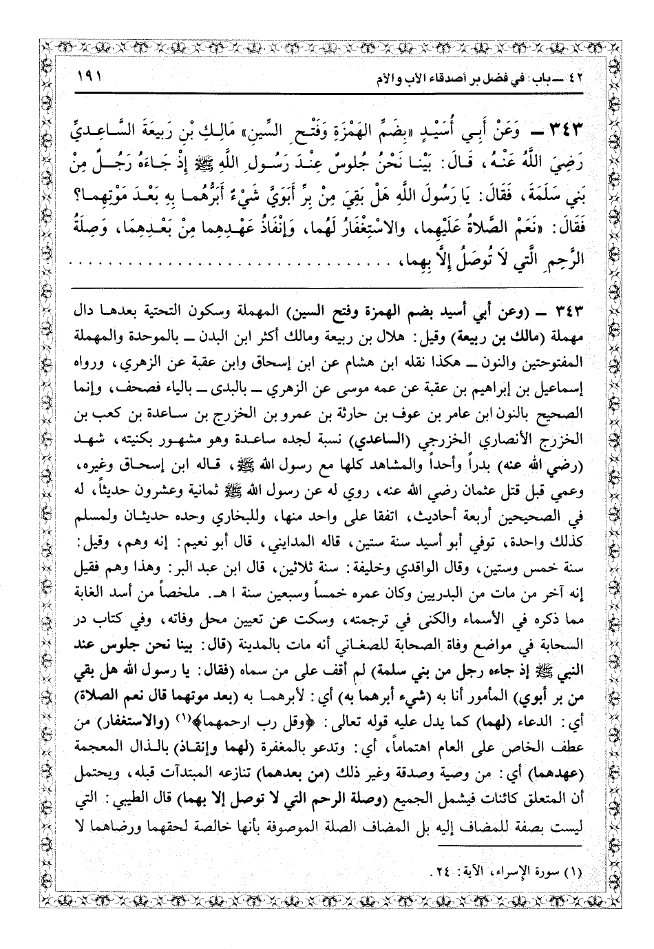3343 - (وعن أبي أسيد بضم الهمزة وفتح السين) المهملة وسكون التحتية بعدها دال مهملة (مالك بن ربيعة) وقيل هلال بن ربيعة ومالك أثكر، ابن البدن بالموحدة والمهملة المفتوحتين والنون، هكذا نقله ابن هشام عن ابن إسحاق وابن عقبة عن الزهري، ورواه إسماعيل بن إبراهيم بن عقبة عن عمه موسى عن الزهري «بالبدى» بالياء فصحف، وإنما الصحيح النون ابن عامر بن عوف بن حارثة بن عمرو بن الخزرج بن ساعدة بن كعب بن الخزرج الأنصاري الخزرجي (الساعدي) نسبة لجده ساعدة وهو مشهور بكنيته، شهد (رضي الله عنه) بدراً وأحداً والمشاهد كلها مع رسول الله - صلى الله عليه وسلم - قال ابن أسحاق وغيره، وعمي قبل قتل عثمان رضي الله عنه، روي له عن رسول الله - صلى الله عليه وسلم - ثمانية وعشرون حديثاً، له في الصحيحين أربعة أحاديث اتفقا على واحد منها، وللبخاري وحده حديثان، ولمسلم كذلك واحد، توفي أبو أسيد سنة ستين قاله المدايني، قال أبو نعيم إنه وهم، وقيل سنة خمس وستين. وقال الواقدي وخليفة: سنة ثلاثين، قال ابن عبد البرّ: وهذا وهم فقيل إنه آخر من مات من البدريين، وكان عمره خمساً وسبعين سنة اهـ ملخصاً من «أسد الغابة» مما ذكره في الأسماء والكنى في ترجمته، وسكت عن تعيين محل وفاته، وفي كتاب «در السحابة في مواضع وفاة الصحابة» للصغاني أنه مات بالمدينة (قال: بينا نحن جلوس عند النبيّ إذ جاءه رجل من بني سلمة) لم أقف على من سماه (فقال: يا رسول الله