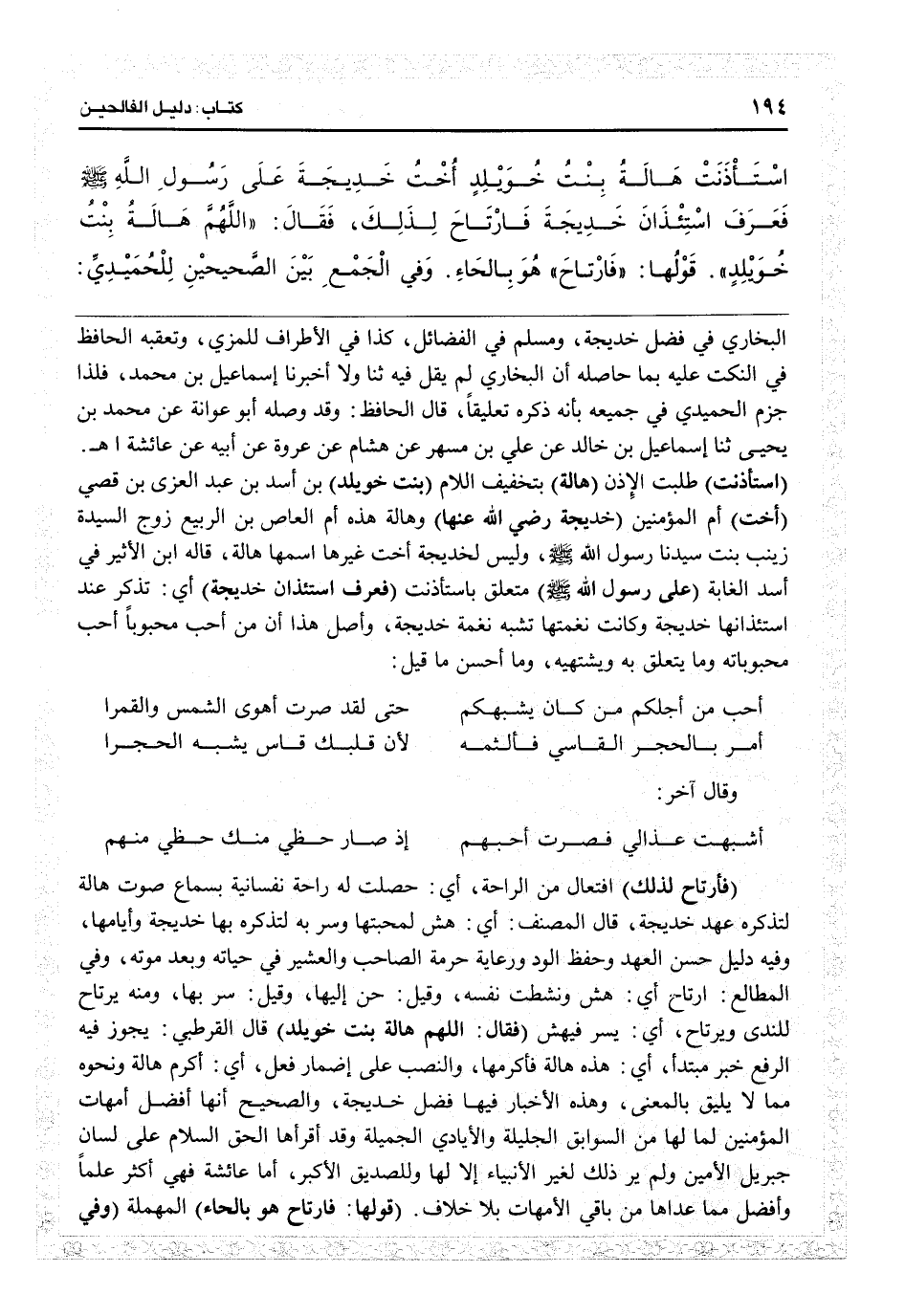 (فارتاح لذلك) افتعال من الراحة: أي حصلت له راحة نفسانية بسماع صوت هالة لتذكره عهد خديجة. قال المصنف: أي هش لمحبتها وسر به لتذكره بها خديجة وأيامها، وفيه دليل حسن العهد وحفظ الود ورعاية حرمة الصاحب والعشير في حياته وبعد موته، وفي المطالع ارتاح أي هشّ ونشطت نفسه، وقيل حن إليها، وقيل سر بها، ومنه يرتاع للندى ويرتاح: أي يسرّ فيهش (فقال: اللهم هالة بنت خويلد) قال القرطبي: يجوز فيه الرفع خبر مبتدأ: أي هذه هالة فأكرمها، والنصب عن إضمار فعل؛ أي أكرم هالة ونحوه مما يليق بالمعنى، وهذه الأخبار فيها فضل خديجة، والصحيح أنها أفضل أمهات المؤمنين لما لها من السوابق الجليلة والأيادي الجميلة، وقد أقرأها الحق السلام على لسان جبريل الأمين، ولم ير ذلك لغير الأنبياء إلا لها وللصديق الأكبر، أما عائشة فهي أكثر علماً وأفضل مما عداها من باقي الأمهات بلا خلاف (قولهما فارتاح هو بالحاء) المهملة (وفي