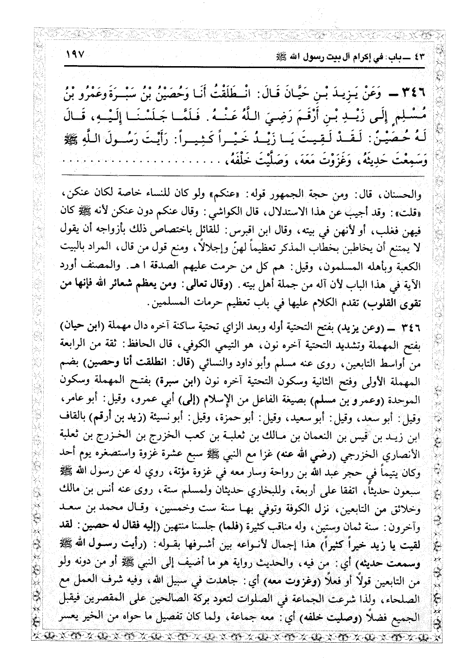 1346 - (وعن يزيد) بفتح التحتية أوله وبعد الزاي تحتية ساكنة آخره دال مهملة (ابن حيان) بفتح المهملة وتشديد التحتية آخره نون: هو التيمي: الكوفي. قال الحافظ: ثقة من الرابعة من أواسط التابعين، روى عنه مسلم وأبو داود والنسائي (قال: انطلقت أنا وحصين) بضم المهملة الأولى وفتح الثانية وسكون التحتية آخره نون (ابن سبرة) بفتح المهملة وسكون الموحدة (وعمرو بن مسلم) بصيغة الفاعل من الإسلام (إلى) أبي عمرو، وقيل أبو عامر، وقيل أبو سعد وقيل أبو سعيد، وقيل أبو حمزة، وقيل أبو نسيئة (زيد بن أرقم) بالقاف ابن زيد بن قيس بن النعمان بن مالك بن ثعلبة بن كعب الخزرج بن الخزرج بن ثعلبة الأنصاري الخزرجي (رضي الله عنه) غزا مع النبي سبع عشرة غزوة واستصغره يوم أحد، وكان يتيماً في حجر عبد الله بن رواحة وسار معه في غزوة ومؤتة، روي له عن رسول الله - صلى الله عليه وسلم - سبعون حديثاً، اتفقا على أربعة، وللبخاري حديثان، ولمسلم ستة، روى عنه أنس بن مالك وخلائق من التابعين، نزل الكوفة وتوفي بها سنة ست وخمسين، وقال محمد بن سعد وآخرون: سنة ثمان وستين، وله مناقب كثيرة (فلما جلسنا) منتهين (إليه فقال له حصين: لقد لقيت يا زيد خيراً كثيراً) هذا إجمال لأنواعه بين أشرفها بقوله: (رأيت رسول الله - صلى الله عليه وسلم - وسمعت حديثه) أي من فيه والحديث رواية: هو ما أضيف إلى النبيّ أو من دونه ولو من التابعين قولاً أو فعلاً (وغزوت معه) أي جاهدت في سبيلالله، وفيه شرف العمل مع الصلحاء، ولذا شرعت الجماعة في الصلوات لتعود بركة الصالحين على المقصرين فيقبل الجميع فضلاً (وصليت خلفه) أي معه جماعة. ولما كان تفصيل ما حواه من الخير يعسر