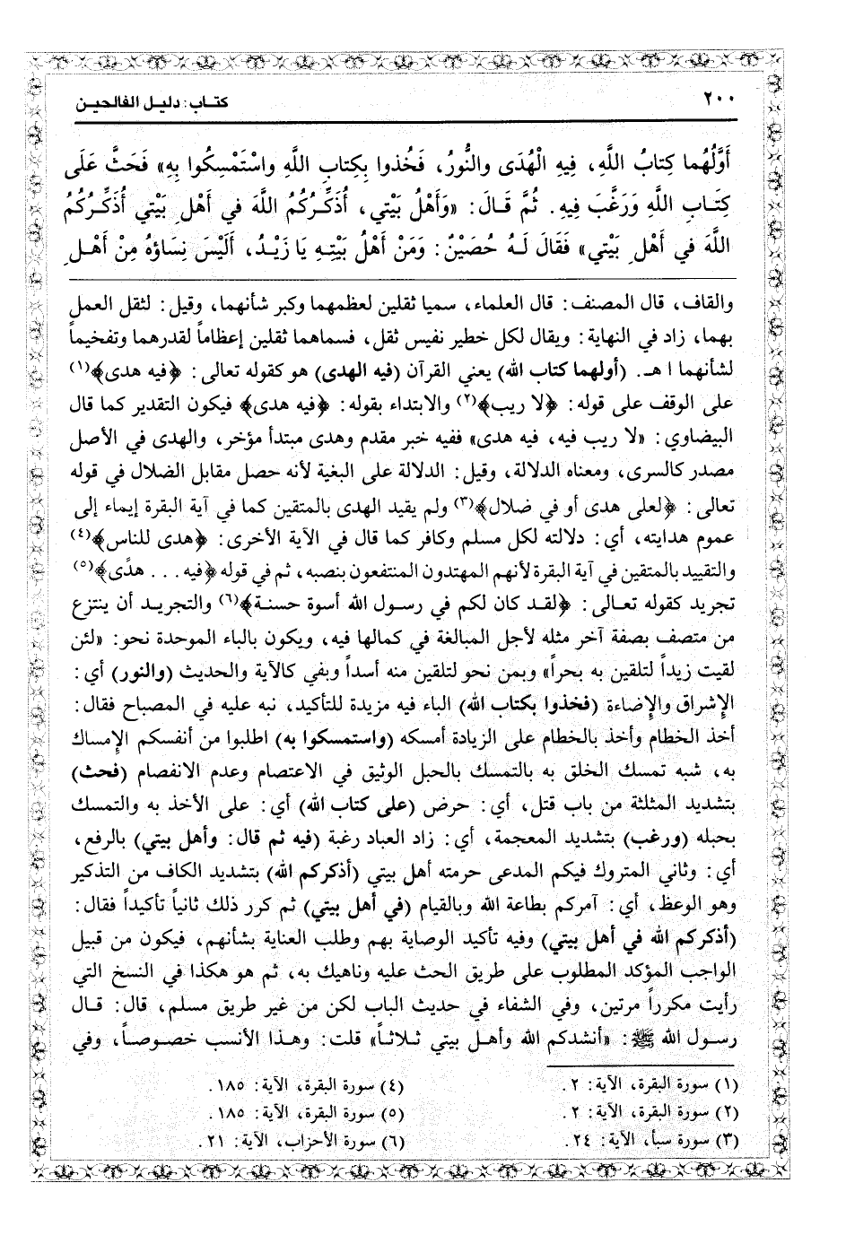 (فخذوا بكتاب ا) الباء فيه مزيدة للتأكيد نبه عليه في «المصباح» ، فقال أخذ الخطام وأخذ بالخطام على الزيادة أمسكه (واستمسكوا به) اطلبوا من أنفسكم الإمساك به، شبه تمسك الخلق به بالتمسك بالحبل الوثيق في الاعتصام وعدم الانفصام (فحث) بتشديد المثلثة من باب قتل: أي حرض (على كتاب ا) أي على الأخذ به والتمسك بحبله (ورغب) بتشديد المعجمة: أي زاد العباد رغبة (فيه ثم قال: وأهل بيتي) بالرفع: أي وثاني المتروك فيكم المدعى حرمته أهل بيتي (أذكركم ا) بتشديد الكاف من التذكير، وهو الوعظ: أي آمركم بطاعة الله وبالقيام (في أهل بيتي) ثم كرر ذلك ثانياً تأكيداً فقال: (أذكركم الله في أهل بيتي) وفيه تأكيد الوصاية بهم وطلب العناية بشأنهم فيكون من قبيل الواجب المؤكد المطلوب على طريق الحثّ عليه وناهيك به، ثم هو هكذا في النسخ التي رأيت مكرراً مرتين. وفي الشفاء في حديث الباب لكن من غير طريق مسلم قال: قال رسول الله: «أنشدكم الله وأهل بيتي ثلاثاً» قلت: وهذا الأنسب خصوصاً، وفي