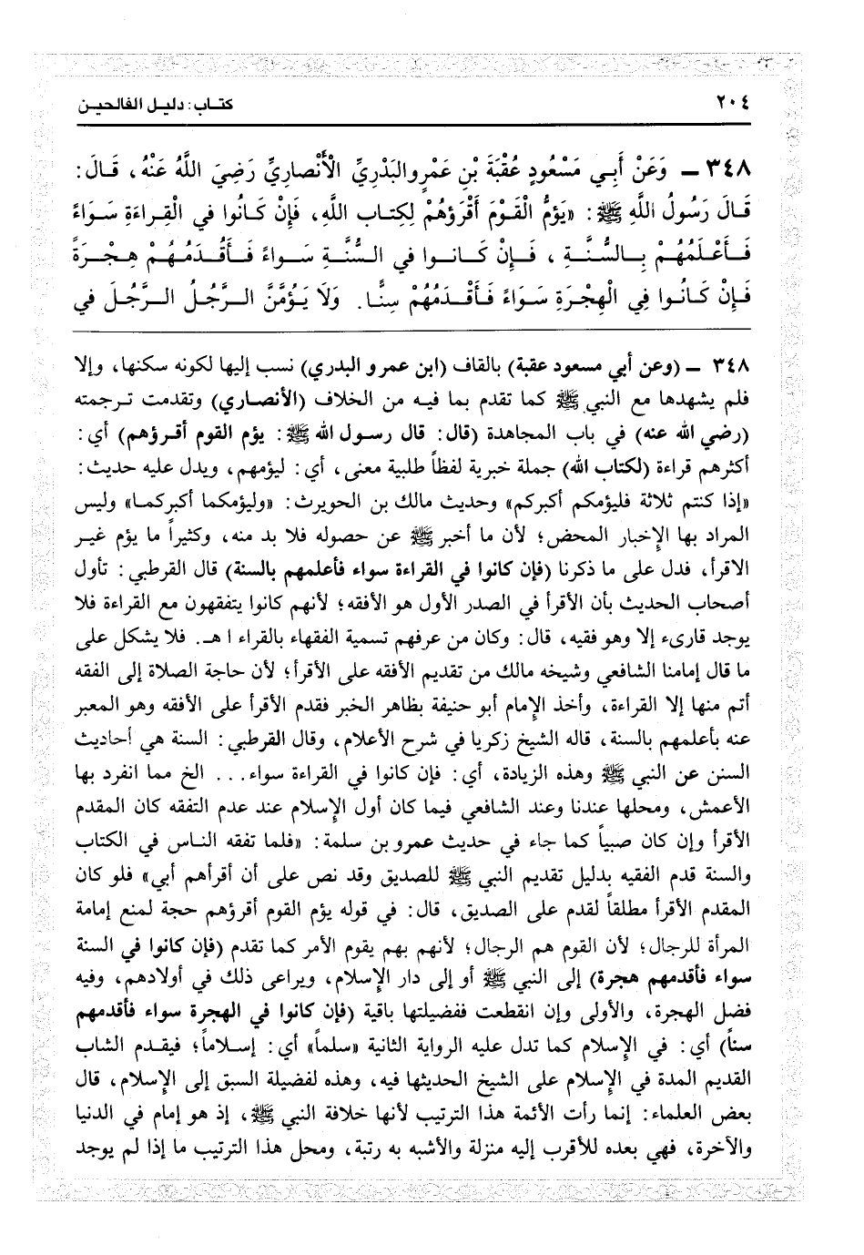 1348 - (وعن ابن مسعود عقبة) بالقاف (ابن عمرو البدري) نسب إليها لكونه سكنها وإلا فلم يشهدها مع النبيّ كما تقدم بما فيه من الخلاف (الأنصاري) وتقدمت ترجمته (رضي الله عنه) في باب المجاهدة (قال: قال رسول الله: يؤم القوم أقرؤهم) أي أكثرهم قراءة (لكتاب ا) جملة خبرية لفظاً طلبية معنى: أي ليؤمهم، ويدل عليه حديث «إذا كنتم ثلاثة فليؤمكم أكبركم» وحديث مالك بن الحويرث «وليؤمكما أكبركما» وليس المراد بها الإخبار المحض لأن ما أخبر عن حصوله فلا بد منه وكثيراً ما يؤم غير الأقرأ فدل على ما ذكرنا (فإن كانوا في القراءة سواء فأعلمهم بالسنة) قال القرطبي: تأول أصحاب الحديث بأن الأقرأ في الصدر الأول هو الأفقه، لأنهم كانوا يتفقهون مع القراءة فلا يوجد قارىء إلا وهو فقيه، قال: وكان من عرفهم تسمية الفقهاء بالقراء اهـ. فلا يشكل على ما قال إمامنا الشافعي وشيخه مالك من تقديم الأفقه على الأقرأ لأن حاجة الصلاة إلى الفقه أتم منها إلى القراءة، وأخذ الإمام أبو حنيفة بظاهر الخبر فقدم الأقرأ على الأفقه وهو المعبر عنه بأعلمهم بالسنة، قاله الشيخ زكريا في «شرح الإعلام» . وقال القرطبي: السنة هي أحاديث السنن عن النبيّ، وهذه الزيادة: أي فإن كانوا في القراءة سواء الخ مما انفرد بها الأعمش ومحلها عندنا وعند الشافعي فيما كان أوّل الإسلام عند عدم التفقه كان المقدم الأقرأ وإن كان صبياً كما جاء في حديث عمرو بن سلمة، فلما تفقه الناس في الكتاب والسنة قدم الفقيه بدليل تقديم النبي للصدّيق، وقد نص على أن أقرأهم أبيّ، فلو كان المقدم الأقرأ مطلقاً لقدم على الصدّيق، قيل له في قوله: «يؤم القوم أقرؤهم» حجة لمنع إمامة المرأة للرجال لأن القوم هم الرجال لأنهم بهم يقوم الأمر كما تقدم (فإن كانوا في السنة سواء فأقدمهم هجرة) إلى النبي، أو إلى دار الإسلام ويراعى ذلك في أولادهم وفيه فضل الهجرة، والأولى وإن انقطعت ففضيلتها باقية (فإن