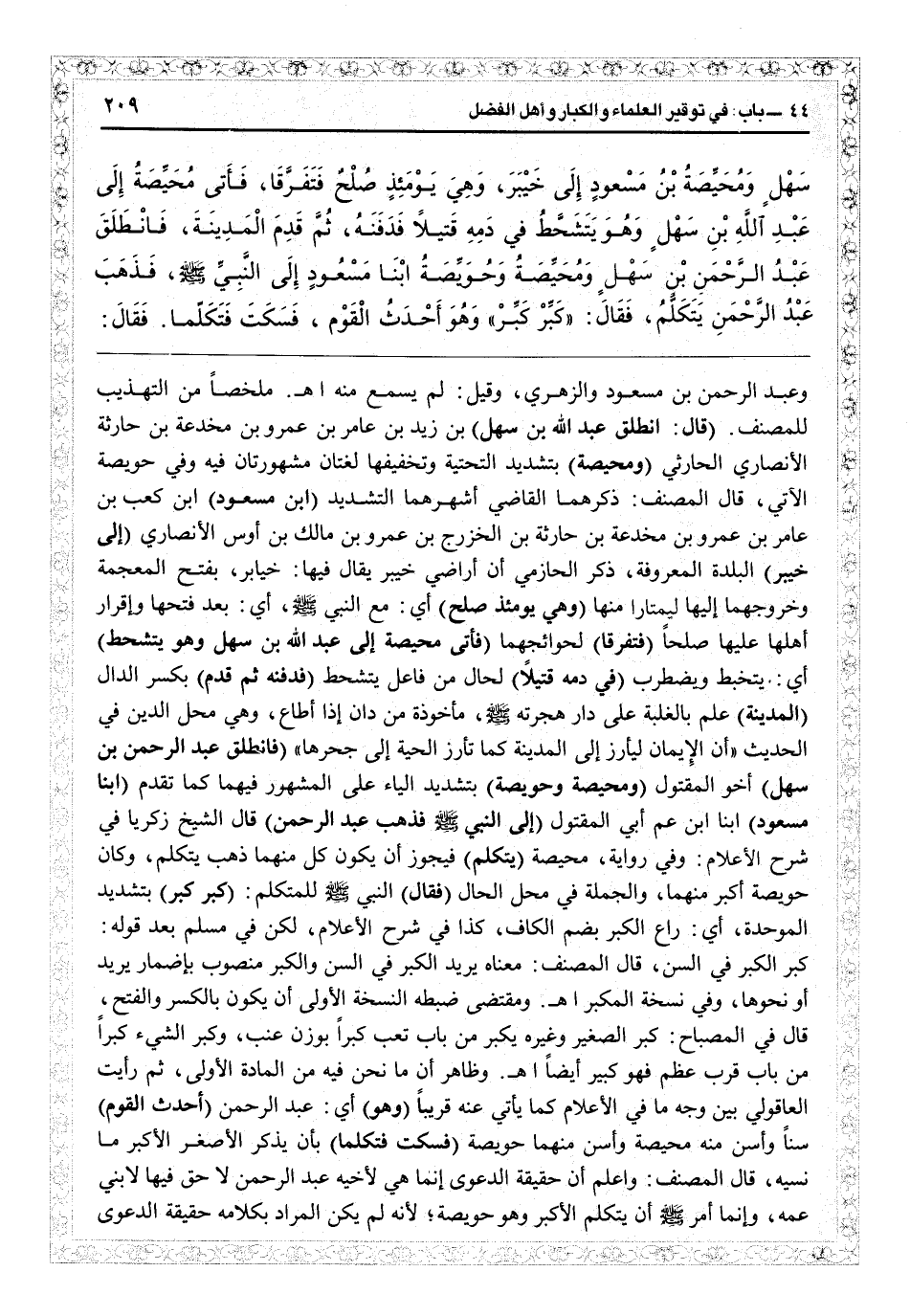 وعبد الرحمن بن مسعود والزهري، وقيل لم يسمع منه اهـ ملخصاً من «التهذيب» للمصنف (قال: انطلق عبد الله بن سهل) ابن زيد بن عامر بن عمرو بن مخدعة ابن حارثة الأنصاري الحارثي (ومحيصة) بتشديد التحتية وتخفيفها لغتان مشهورتان فيه وفي حويصة الآتي، قال المصنف: ذكرهما القاضي أشهرهما التشديد (ابن مسعود) بن كعب بن عامر بن عمرو بن مخدعة بن حارثة بن الخزرج بن عمرو بن مالك بن أوس الأنصاري (إلى خيبر) البلدة المعروفة ذكر الحازمي أن أراضي خيبر يقال فيها خيابر بفتح المعجمة وخروجهما إليها ليمتارا منها (وهي يومئذٍ صلح) أي مع النبيّ أي بعد فتحها وإقرار أهلها عليها صلحاً (فتفرقا) لحوائجهما (فأتى محيصة إلى عبد الله بن سهل وهو يتشحط) أي يتخبط ويضطرب (في دمه قتيلاً) حال من فاعل يتشحط (فدفنه ثم قدم) بكسر الدال (المدينة) علم بالغلبة على دار هجرته مأخوذة من دان إذا أطاع وهي محل الدين في الحديث «إن الإيمان ليأرز إلى المدينة كما تأرز الحية إلى جحرها» (فانطلق عبد الرحمن ابن سهل) أخو المقتول (ومحيصة وحويصة) بتشديد الياء على المشهور فيهما كما تقدم (ابنا مسعود) ابنا ابن عم أبي المقتول (إلى النبي فذهب عبد الرحمن) قال الشيخ زكريا في «شرح الإعلام» وفي رواية «محيصة» (يتكلم) فيجوز أن يكون كل منهما ذهب يتكلم وكان حويصة أكبر منهما والجملة في محل الحال