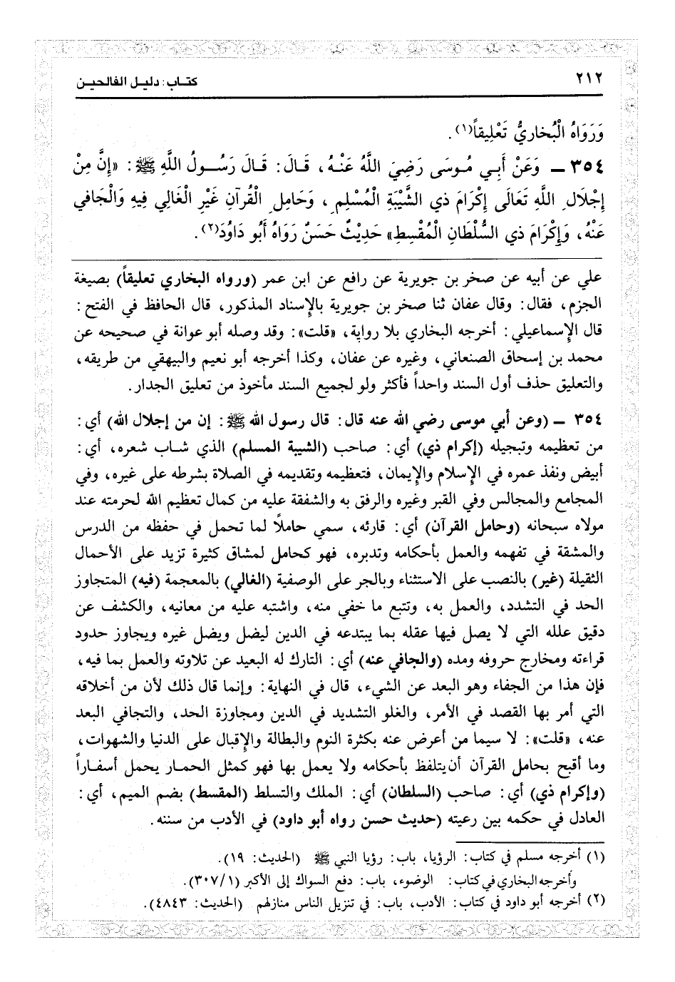 7354 - (وعن أبي موسى رضي الله عنه قال: قال رسول الله: إن من إجلال ا) أي من تعظيمه وتبجيله (إكرام ذي) أي صاحب (الشيبة المسلم) الذي شاب شعره: أي ابيضّ ونفذه عمره في الإسلام والإيمان فتعظيمه وتقديمه في الصلاة بشرطه على غيره وفي المجامع والمجالس وفي القبر وغيره والرفق به والشفقة عليه من كمال تعظيم الله لحرمته عند مولاه سبحانه (وحامل القرآن) أي قارئه، سمي حاملاً لما تحمل في حفظه من الدرس والمشقة في تفهمه والعمل بأحكامه وتدبره فهو كحامل لمشاق كثيرة تزيد على الأحمال الثقيلة (غير) بالنصب على الاستثناء وبالجر على الوصفية (الغالي) بالمعجمة (فيه) المتجاوز الحد في التشدد والعمل به وتتبع ما خفي منه واشتبه عليه من معانيه، والكشف عن دقيق علله التي لا يصلح فيها عقله بما يبتدعه في الدين ليضلّ ويضلّ غيره ويجاوز حدود قراءته ومخارج حروفه ومده (والجافي عنه) أي التارك له البعيد عن تلاوته والعمل بما فيه فإن هذا من الجفاء وهو البعد عن الشيء. قال في «النهاية» : وإنما قال ذلك لأن من أخلاقه التي أمر بها القصد في الأمر. والغلوّ: التشديد في الدين ومجاوزة الحد، والتجافي: البعد عنه. قلت: لا سيما من أعرض عنه كثرة النوم والبطالة والإقبال على الدنيا والشهوات، وما أقبح بحامل القرآن أن يتلفظ بأحكامه ولا يعمل بها، فهو كمثل الحمار يحمل أسفاراً (وإكرام ذي) أي صاحب (السلطان) أي الملك والتسلط (المقسط) بضم الميم: أي العادل في حكمه بين رعيته (حديث حسن رواه أبو داود) في الأدب من سننه.
