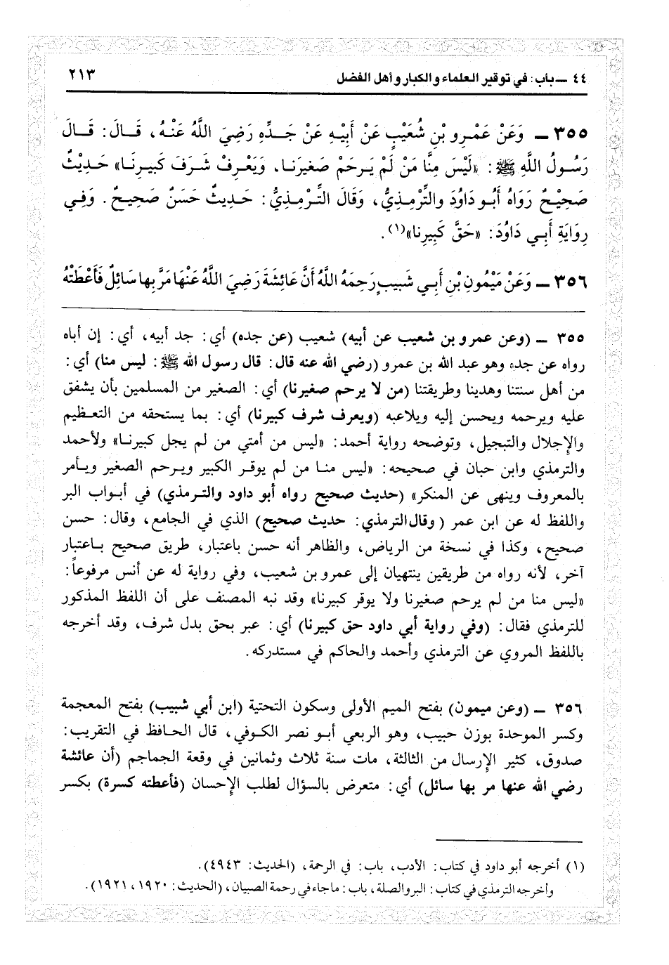 8355 - (وعن عمرو بن شعيب عن أبيه) شعيب (عن جده) أي جد أبيه: أي إن أباه رواه عن جده وهو عبد الله بن عمرو (رضي الله عنه قال: قال رسول الله: ليس منا) أي من أهل سنتنا وهدينا وطريقتنا (من لا يرحم صغيرنا) أي الصغير من المسلمين بأن يشفق عليه ويرحمه ويحسن إليه ويلاعبه (ويعرف شرف كبيرنا) أي بما يستحقه من التعظيم والإجلال والتبجيل وتوضحه رواية أحمد «ليس من أمتي من لم يجلّ كبيرنا» ولأحمد والترمذي وابن حبان في صحيحه «ليس منا من لم يوقر الكبير ويرحم الصغير ويأمر بالمعروف وينهى عن المنكر» (حديث صحيح رواه أبو داود والترمذي) في أبواب البر واللفظ له عن ابن عمر (وقال الترمذي: حديث صحيح) الذي في «الجامع» وقال: حسن صحيح، وكذا في نسخة من الرياض، والظاهر أنه حسن باعتبار طريق صحيح باعتبار طريق آخ لأنه رواه من طريقين ينتهيان إلى عمرو بن شعيب، وفي رواية له عن أنس مرفوعاً؟ ليس منا من لم يرحم صغيرنا ولا يوقر كبيرنا» وقد نبه المصنف على أن اللفظ المذكور للترمذي فقال: