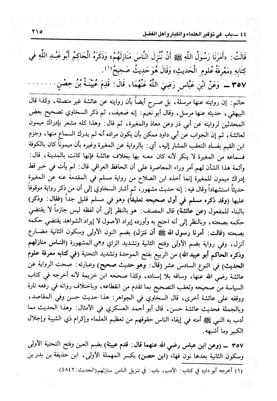 المشهورة (الناس منازلهم وذكره الحاكم أبو عبيد ا) بن الربيع بفتح الموحدة وتشديد التحتية (في كتابة معرفة علوم الحديث) في النوع السادس عشر (قال: وهو حديث صحيح) وعبارته «صحت الرواية عن عائشة رضي الله عنها» وساقه بلا إسناد وكذا صححه ابن خزيمة لأنه أخرجه في كتاب السياسة من صحيحه، وتعقب التصحيح بما تقدم من انقطاعه وباختلاف رواته في رفعه تارة ووقفه على عائشة أخرى. قال السخاوي في «الجواهر» : هذا حديث حسن. وفي المقاصد: وبالجملة فحديث عائشة حسن، قال أبو أحمد العسكري في الأمثال: وهذا الحديث مما أدب به النبيّ أمته في إيفاء الناس حقوقهم من تعظيم العلماء وإكرام ذي الشيبة وإجلال الكبير وما أشبهه.
